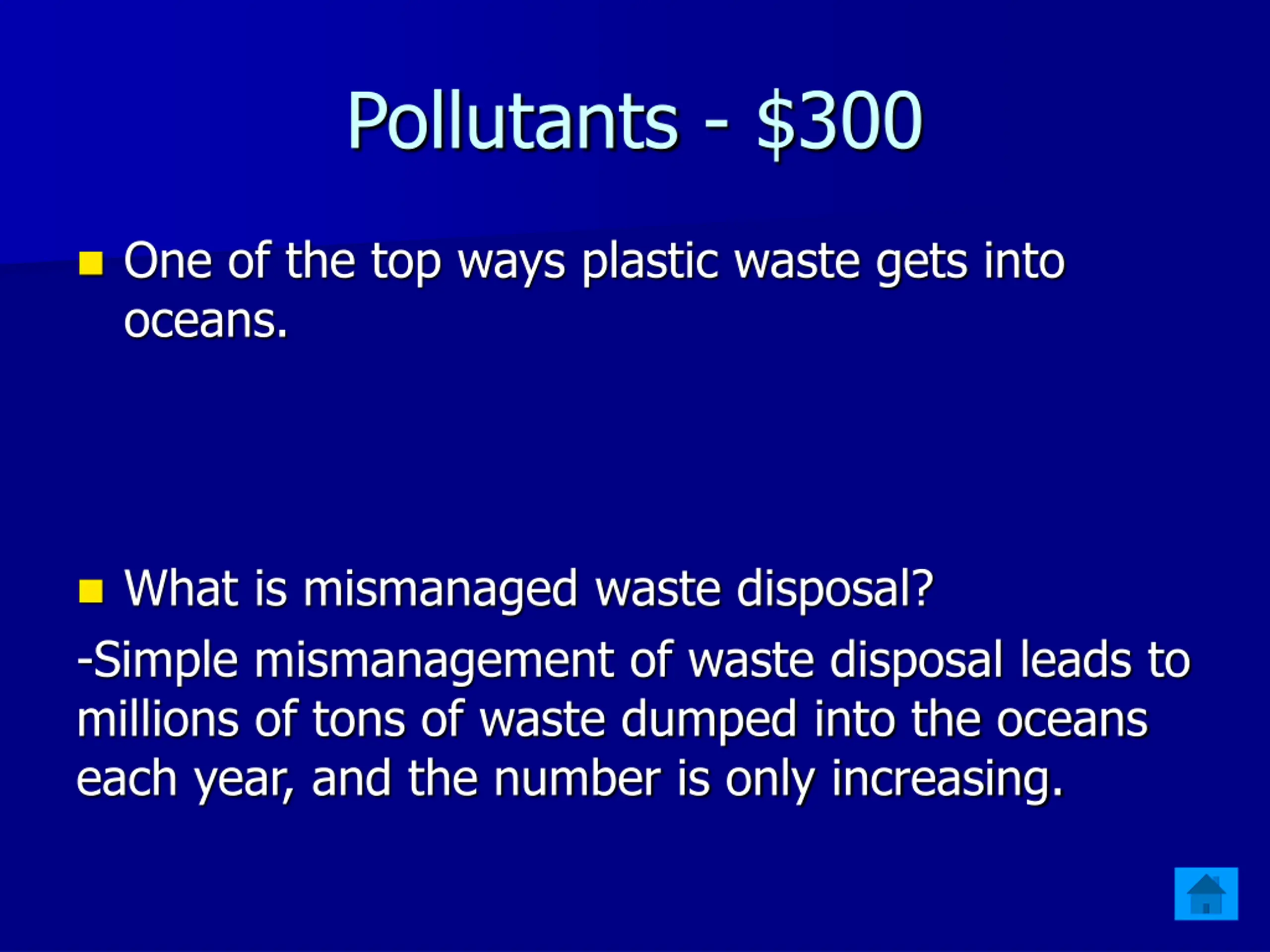 Pollutants - $300 One of the top ways plastic waste gets into oceans. What is mismanaged waste disposal? -Simple mismanagement of waste disposal leads to millions of tons of waste dumped into the oceans each year, and the number is only increasing.