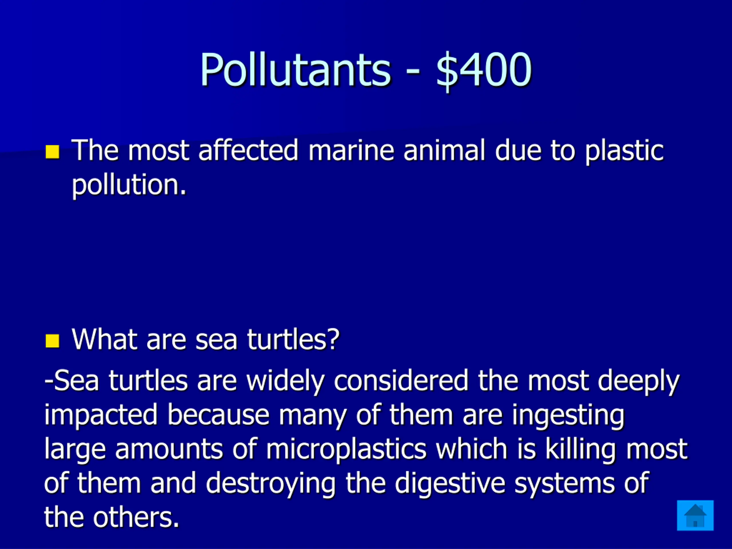 Pollutants - $400 The most affected marine animal due to plastic pollution. What are sea turtles? -Sea turtles are widely considered the most deeply impacted because many of them are ingesting large amounts of microplastics which is killing most of them and destroying the digestive systems of the others.