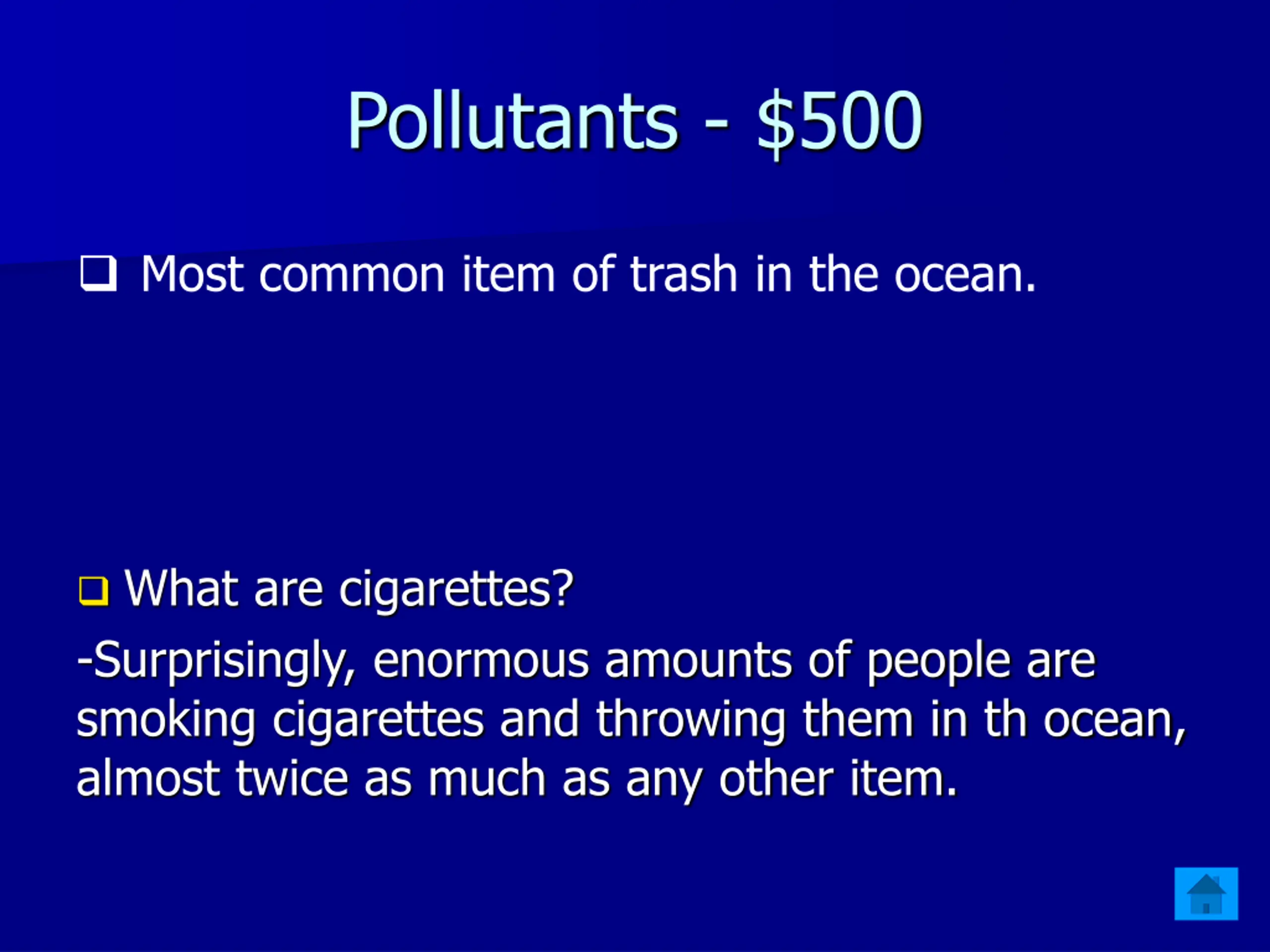Pollutants - $500 Most common item of trash in the ocean. What are cigarettes? -Surprisingly, enormous amounts of people are smoking cigarettes and throwing them in th ocean, almost twice as much as any other item.