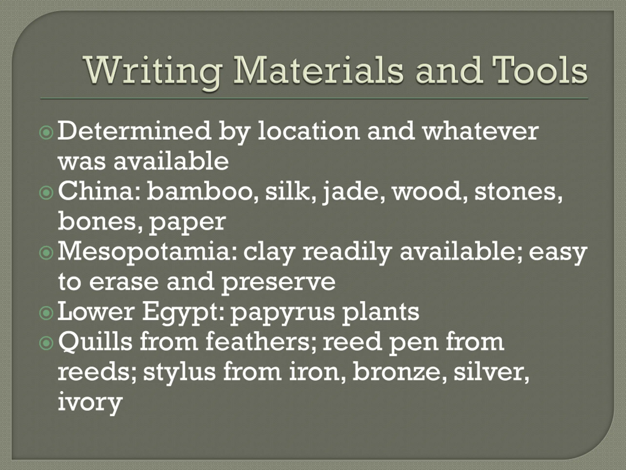 Determined by location and whatever was available China: bamboo, silk, jade, wood, stones, bones, paper Mesopotamia: clay readily available; easy to erase and preserve Lower Egypt: papyrus plants Quills from feathers; reed pen from reeds; stylus from iron, bronze, silver, ivory