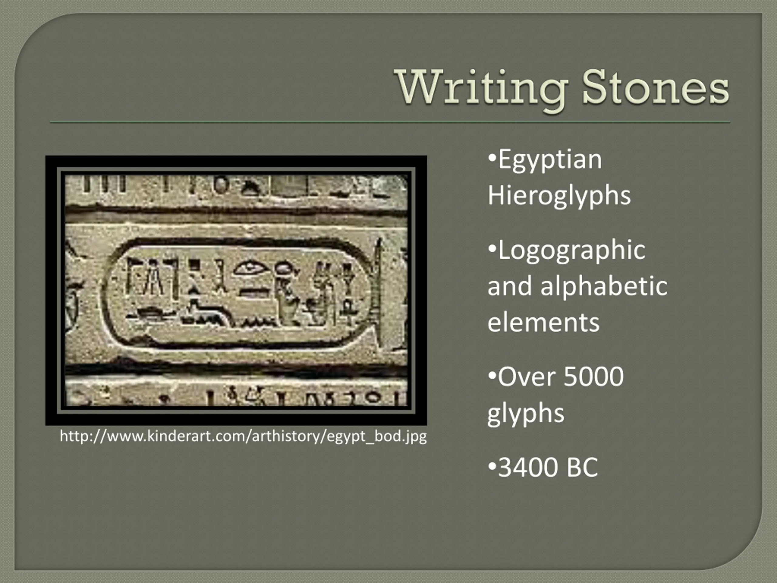 Egyptian Hieroglyphs Egyptian Cartouche Logographic and alphabetic elements Over 5000 glyphs http://www.kinderart.com/arthistory/egypt_bod.jpg 3400 BC