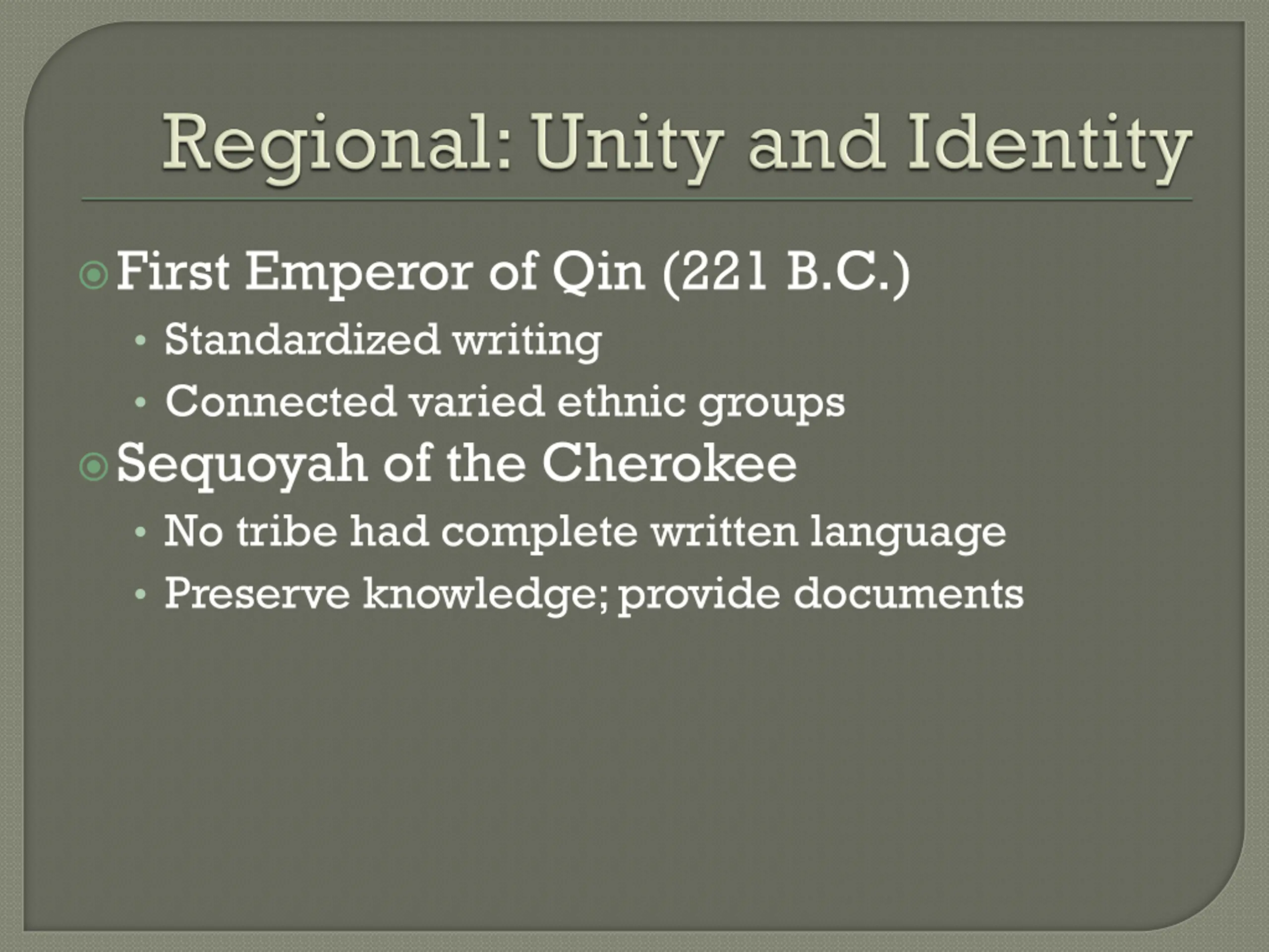 First Emperor of Qin (221 B.C.) Standardized writing Connected varied ethnic groups Sequoyah of the Cherokee No tribe had complete written language Preserve knowledge; provide documents