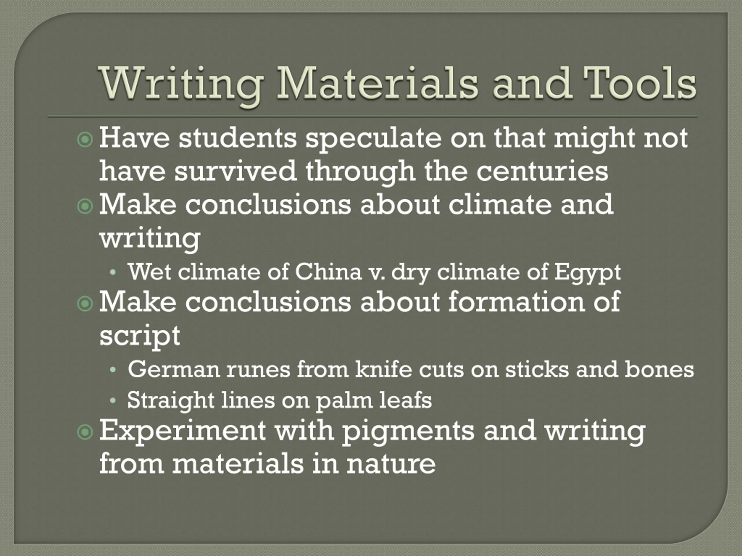 Have students speculate on that might not have survived through the centuries Make conclusions about climate and writing Wet climate of China v. dry climate of Egypt Make conclusions about formation of script German runes from knife cuts on sticks and bones Straight lines on palm leafs Experiment with pigments and writing from materials in nature