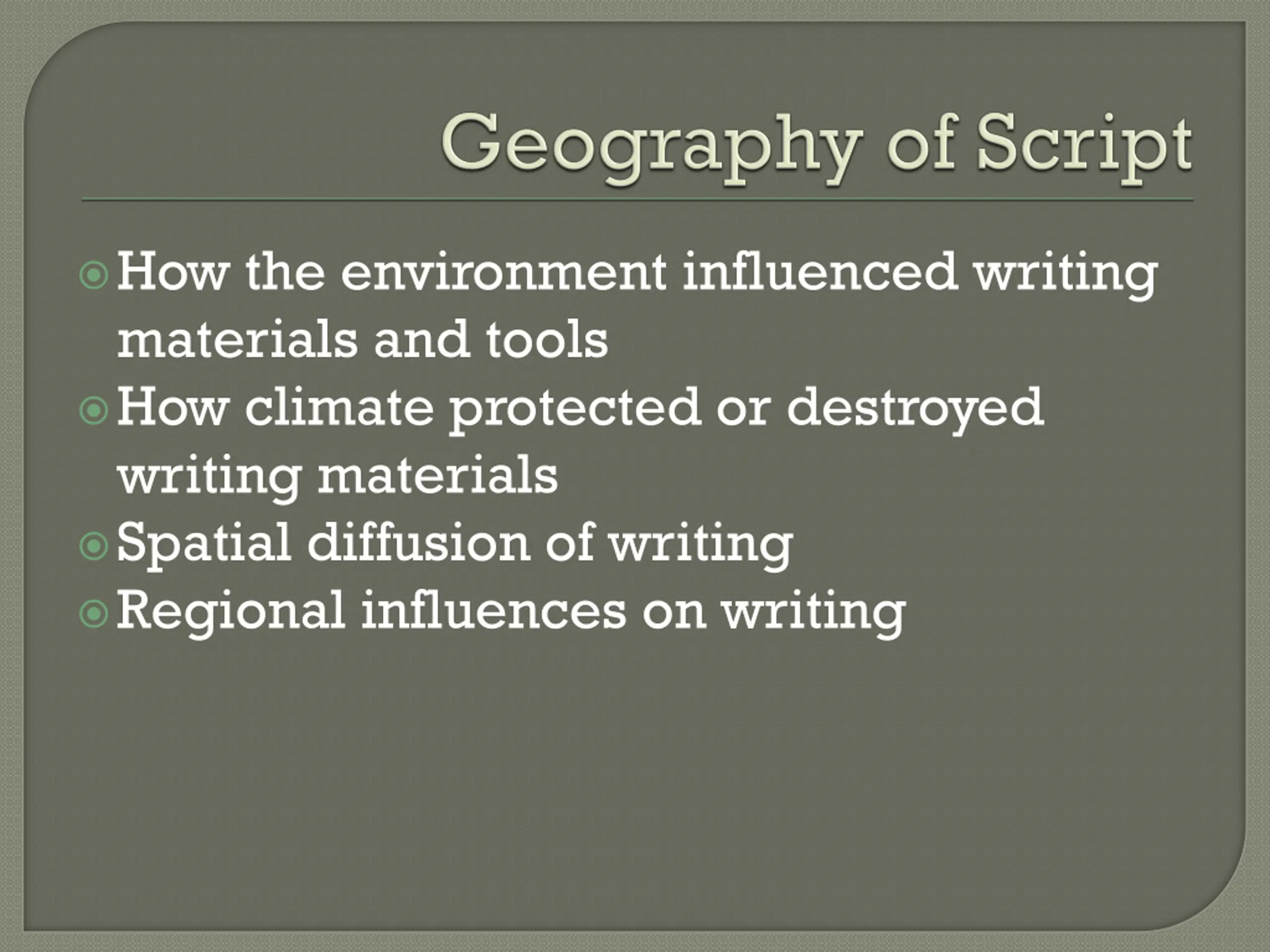 How the environment influenced writing materials and tools How climate protected or destroyed writing materials Spatial diffusion of writing Regional influences on writing
