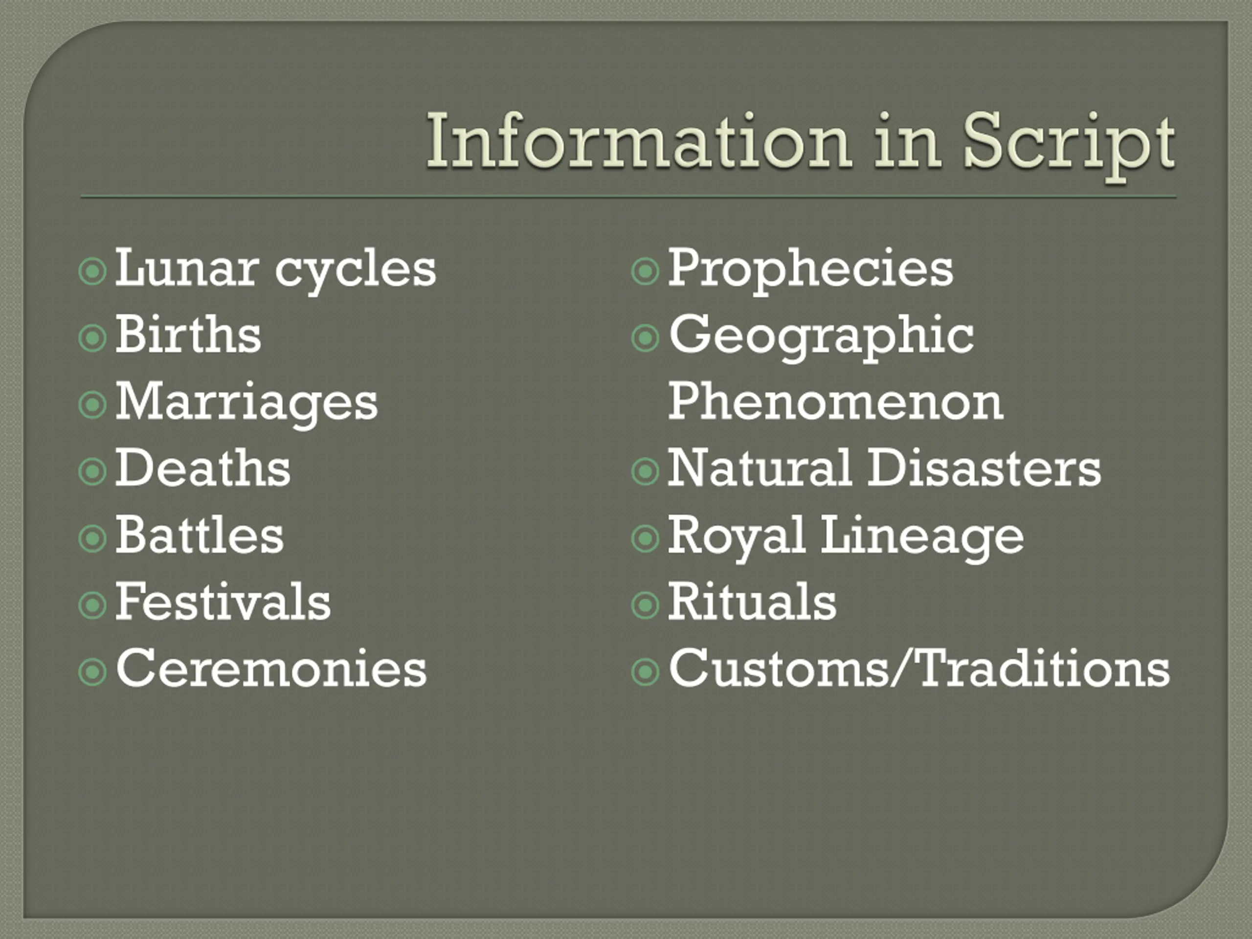 Lunar cycles Births Marriages Deaths Battles Festivals Ceremonies Prophecies Geographic Phenomenon Natural Disasters Royal Lineage Rituals Customs/Traditions