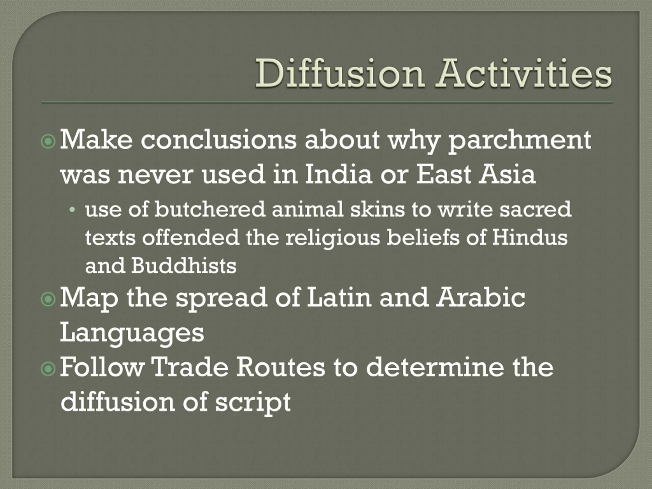 Make conclusions about why parchment was never used in India or East Asia use of butchered animal skins to write sacred texts offended the religious beliefs of Hindus and Buddhists Map the spread of Latin and Arabic Languages Follow Trade Routes to determine the diffusion of script