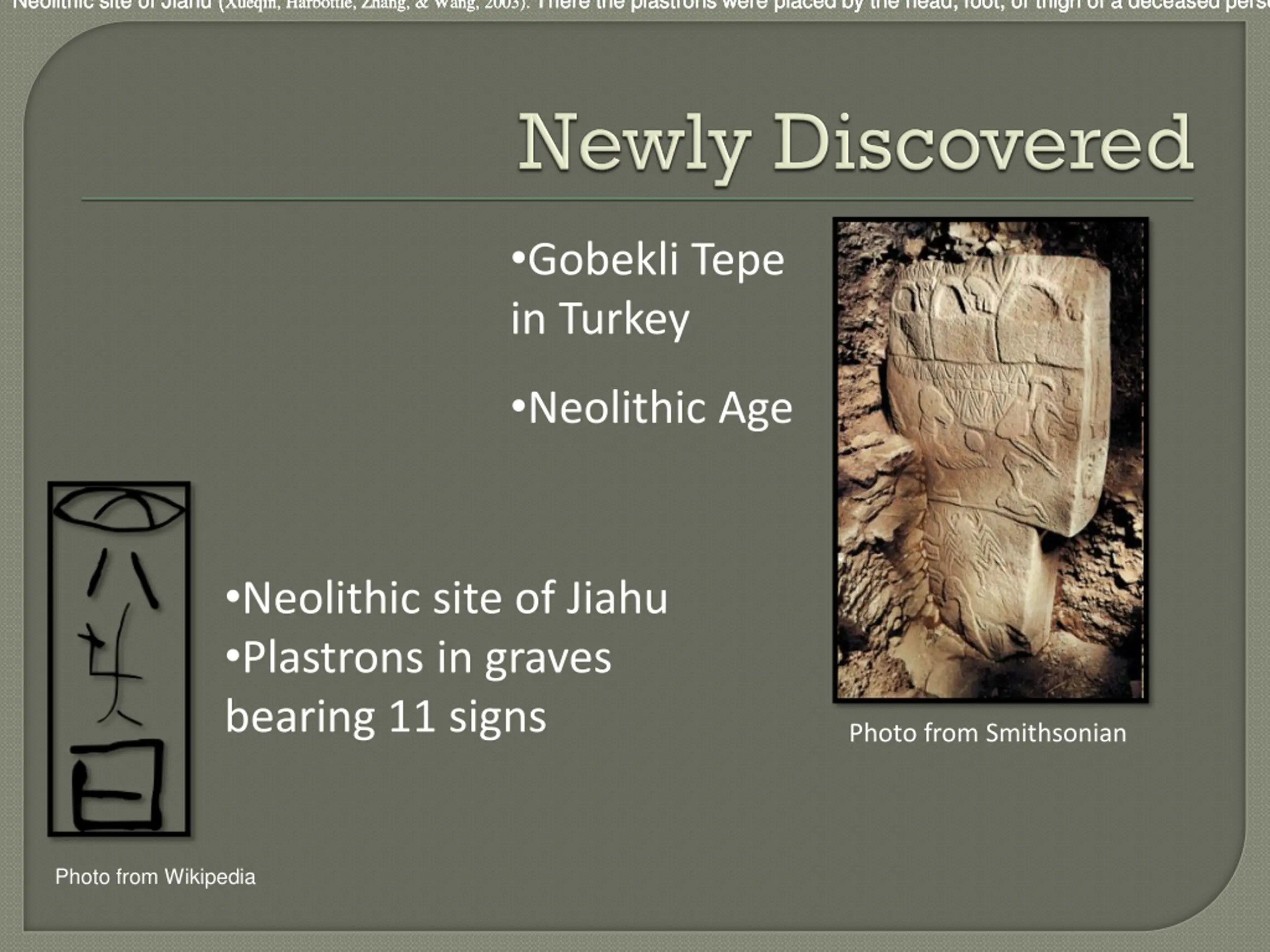 Neolithic site of Jiahu (Xueqin, Harbottle, Zhang, & Wang, 2003). There the plastrons were placed by the head, foot, or thigh of a deceased person and carried incised marks featuring 11 diffe Neolithic site of Jiahu (Xueqin, Harbottle, Zhang, & Wang, 2003). There the plastrons were placed by the head, foot, or thigh of a deceased person and carried incised marks featuring 11 diffe Neolithic site of Jiahu (Xueqin, Harbottle, Zhang, & Wang, 2003). There the plastrons were placed by the head, foot, or thigh of a deceased person and carried incised marks featuring 11 diffe Gobekli Tepe in Turkey Neolithic Age Neolithic site of Jiahu Plastrons in graves bearing 11 signs Photo from Smithsonian Photo from Wikipedia