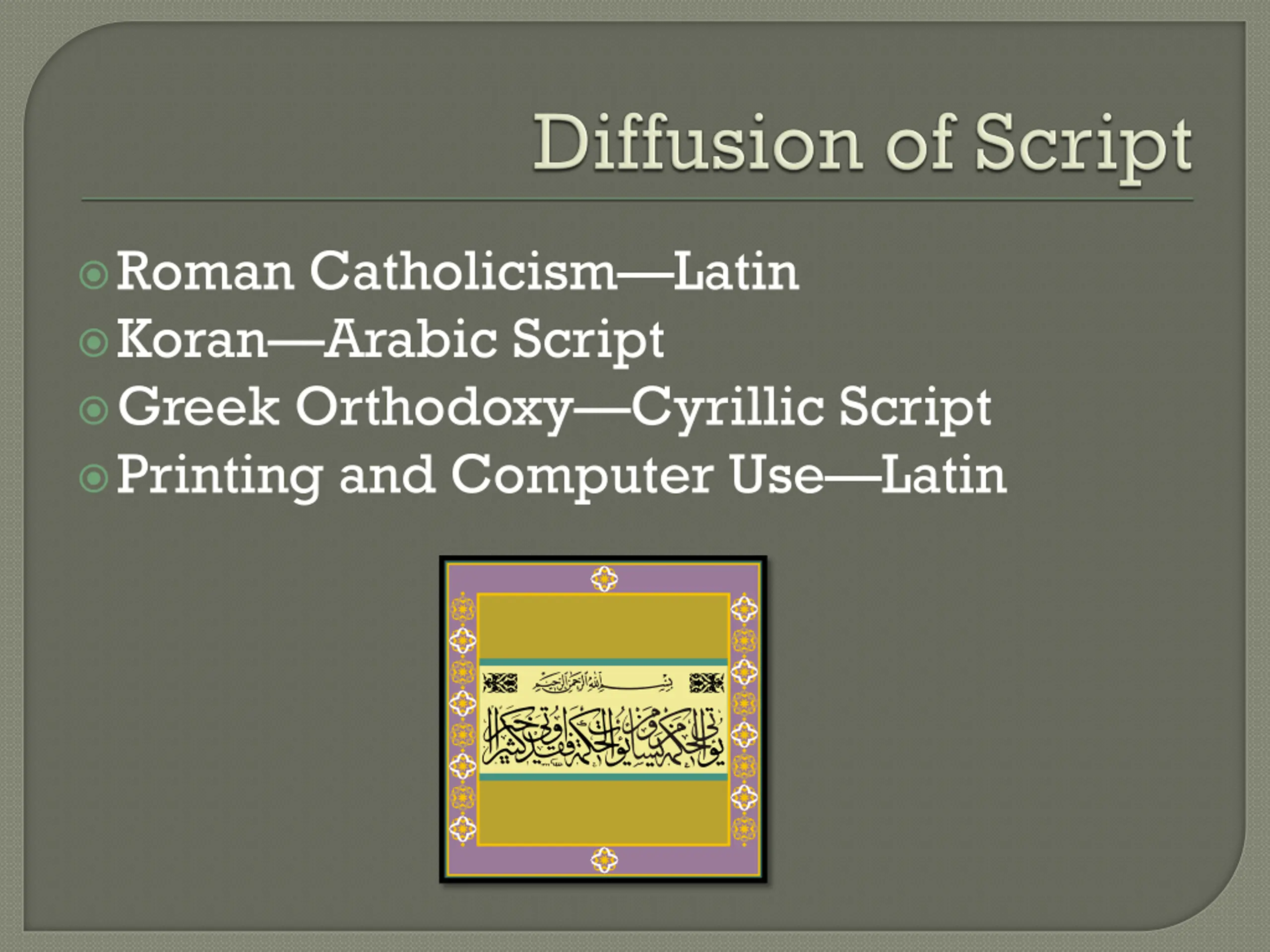 Roman CatholicismLatin Koran Arabic Script Greek Orthodoxy Cyrillic Script Printing and Computer Use Latin