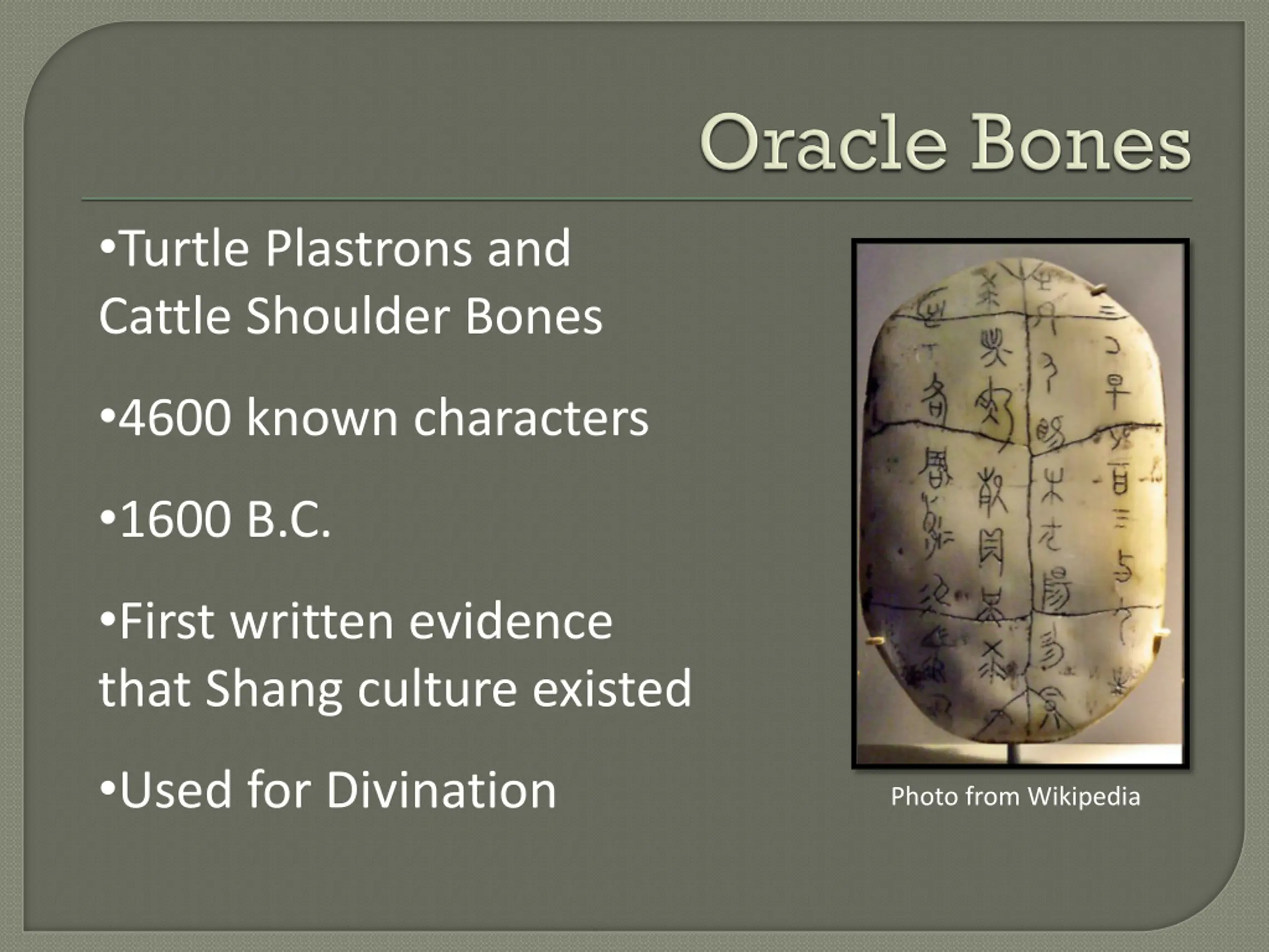 Turtle Plastrons and Cattle Shoulder Bones 4600 known characters 1600 B.C. First written evidence that Shang culture existed Used for Divination Photo from Wikipedia