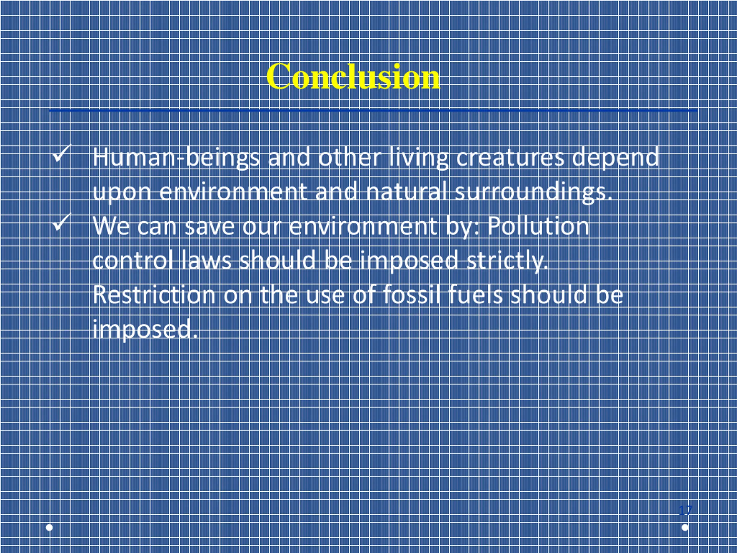 Conclusion Human-beings and other living creatures depend upon environment and natural surroundings. We can save our environment by: Pollution control laws should be imposed strictly. Restriction on the use of fossil fuels should be imposed. 17