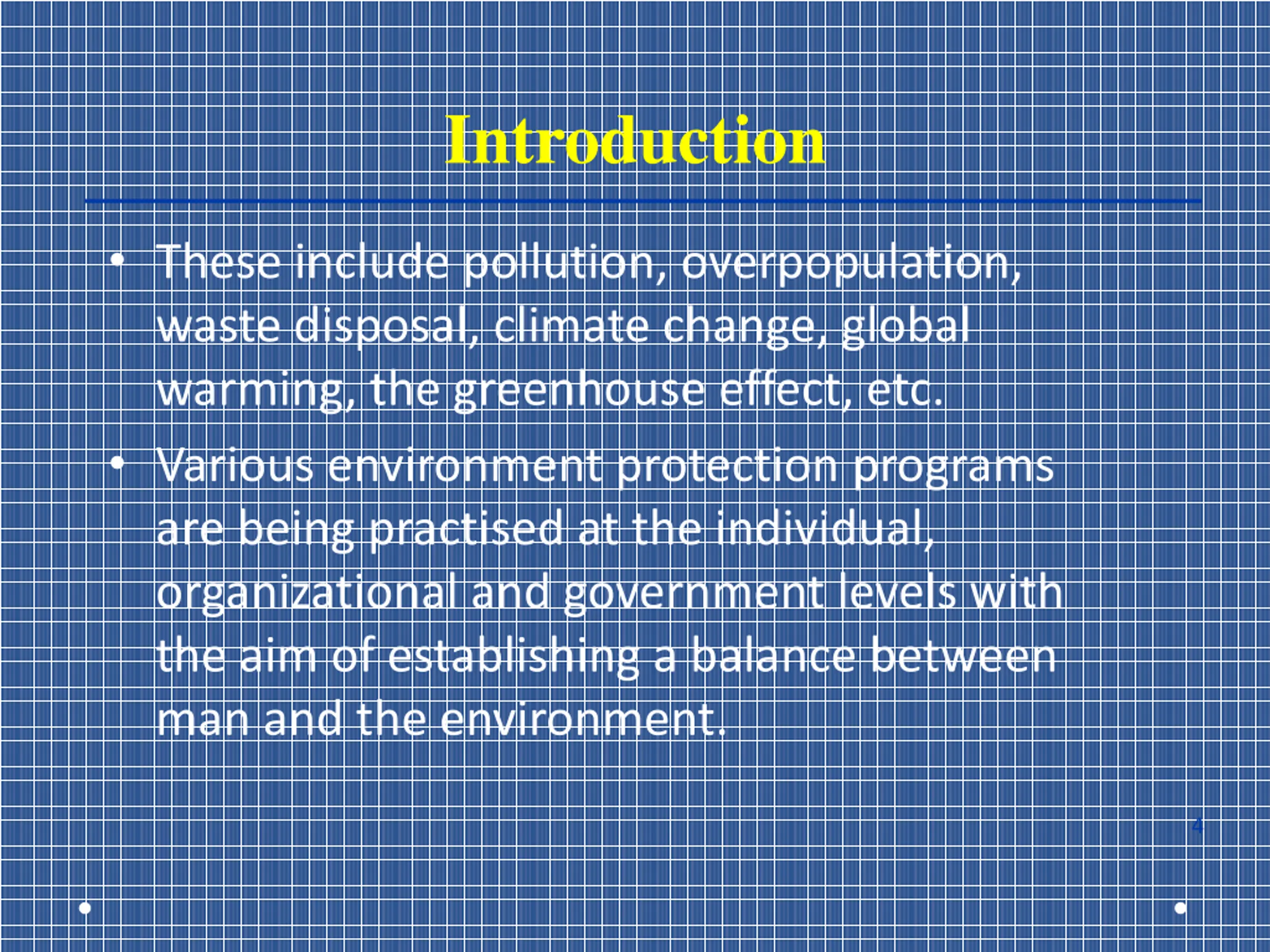 Introduction These include pollution, overpopulation, waste disposal, climate change, global warming, the greenhouse effect, etc. Various environment protection programs are being practised at the individual, organizational and government levels with the aim of establishing a balance between man and the environment. 4