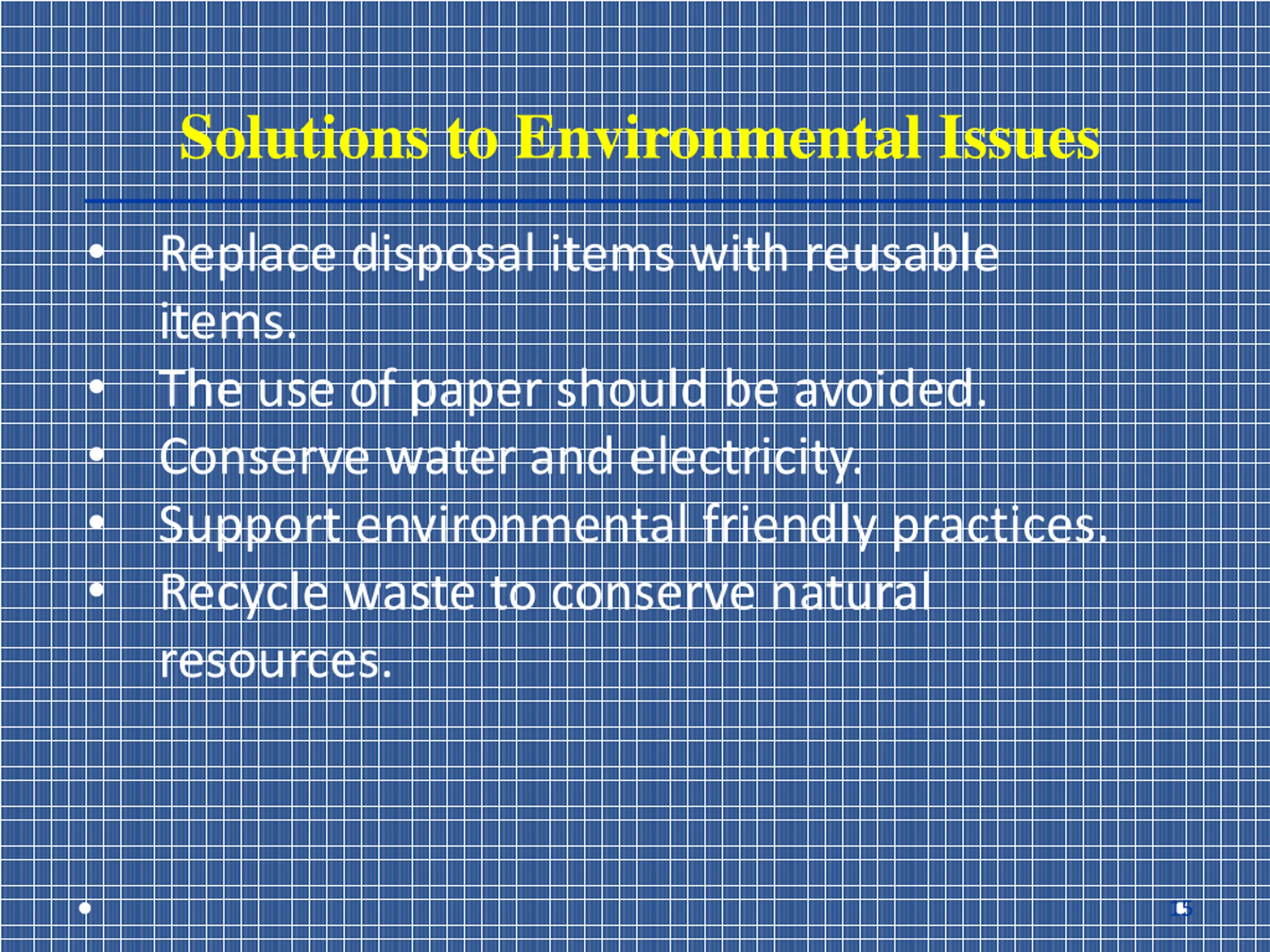 Solutions to Environmental Issues Replace disposal items with reusable items. The use of paper should be avoided. Conserve water and electricity. Support environmental friendly practices. Recycle waste to conserve natural resources. 15