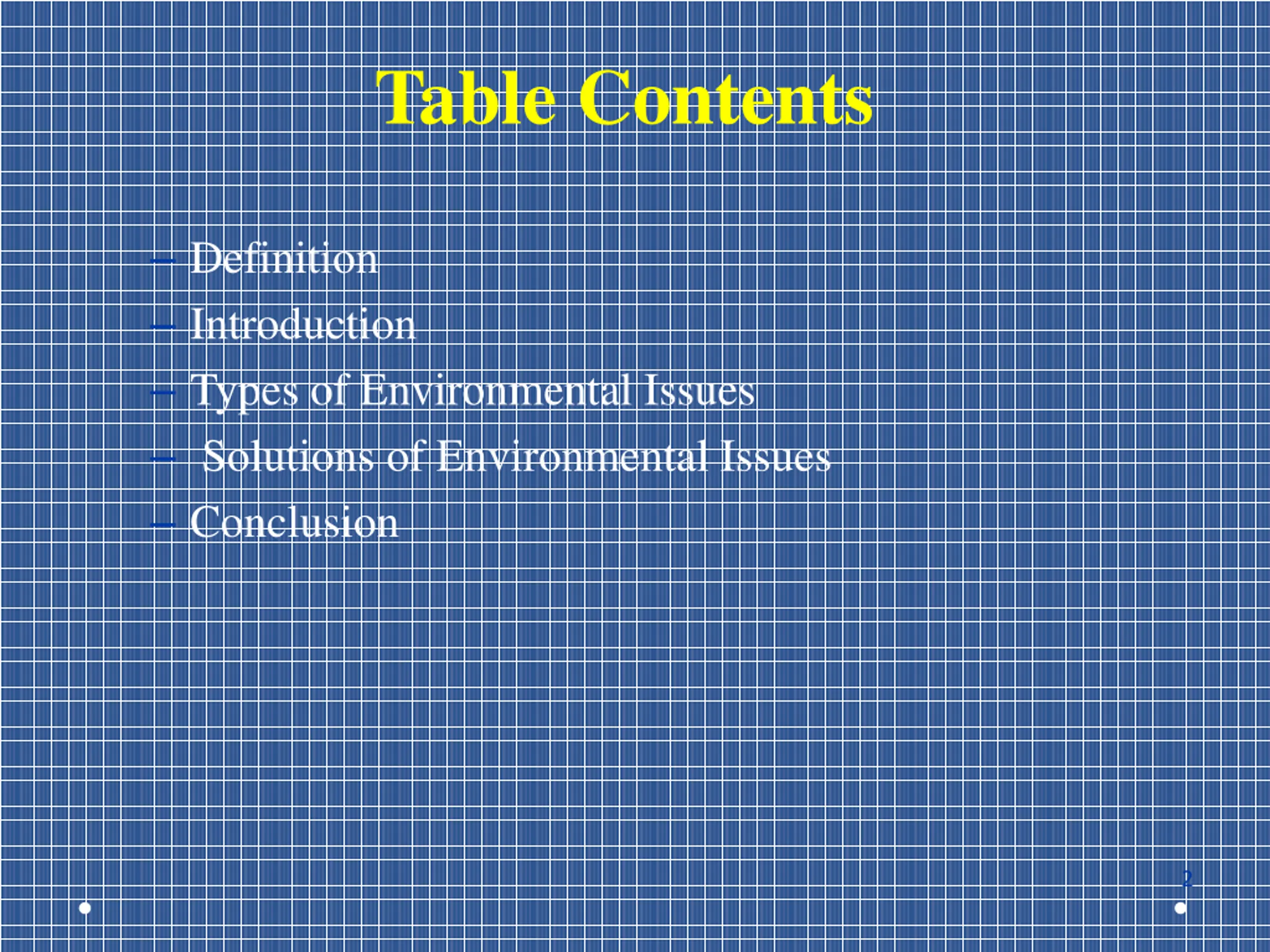 Table Contents Definition Introduction Types of Environmental Issues Solutions of Environmental Issues Conclusion 2