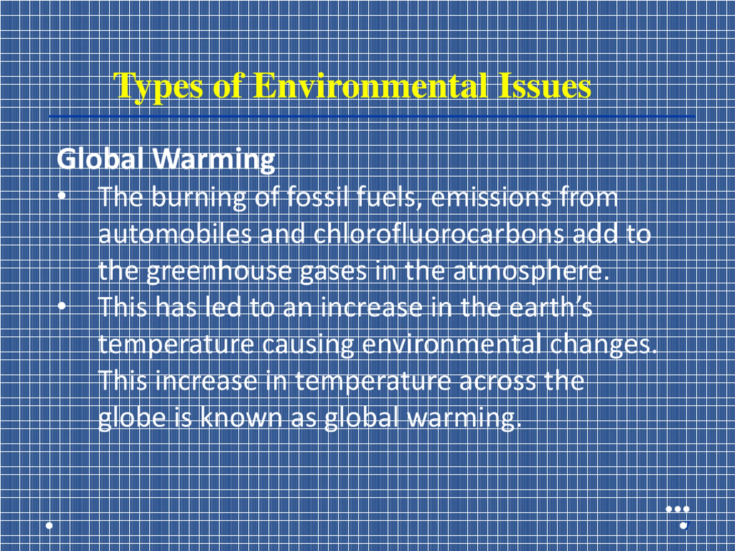 Types of Environmental Issues Global Warming The burning of fossil fuels, emissions from automobiles and chlorofluorocarbons add to the greenhouse gases in the atmosphere. This has led to an increase in the earth s temperature causing environmental changes. This increase in temperature across the globe is known as global warming. 7