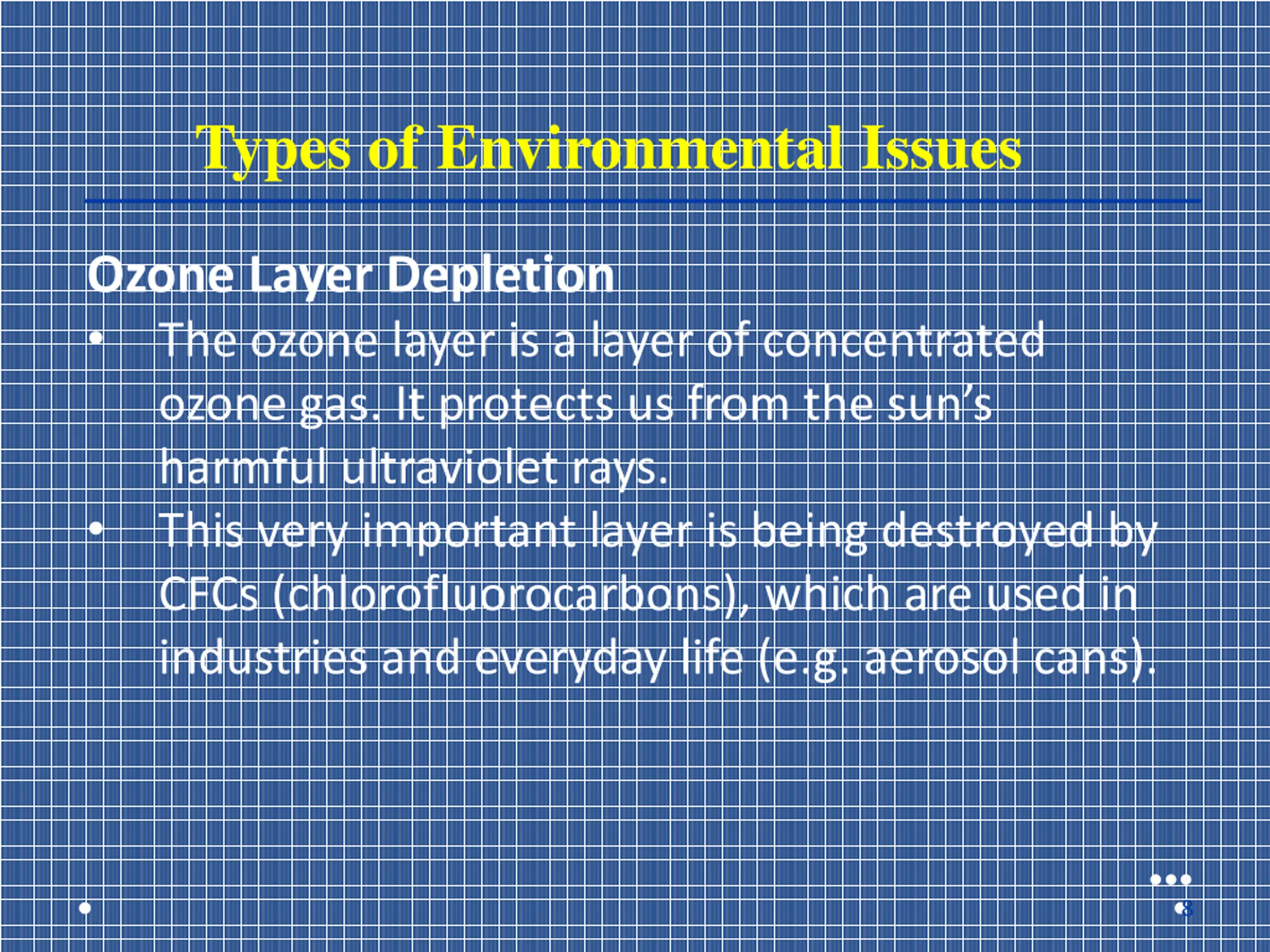 Types of Environmental Issues Ozone Layer Depletion The ozone layer is a layer of concentrated ozone gas. It protects us from the sun s harmful ultraviolet rays. This very important layer is being destroyed by CFCs (chlorofluorocarbons), which are used in industries and everyday life (e.g. aerosol cans). 8