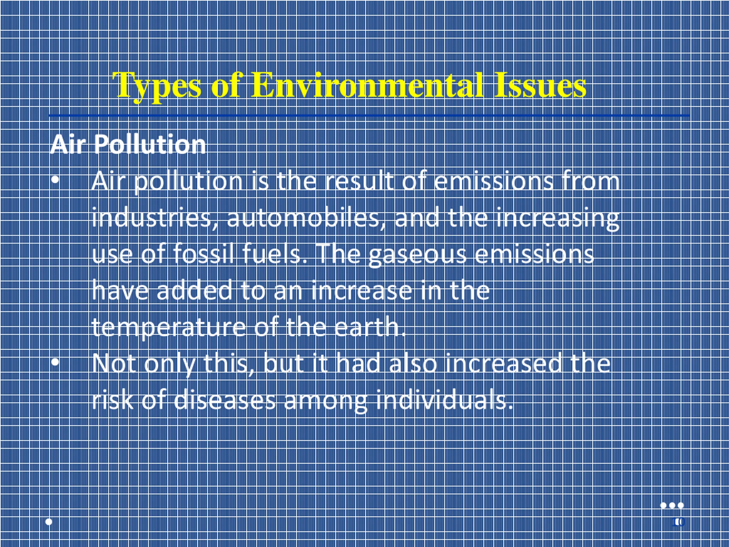 Types of Environmental Issues Air Pollution Air pollution is the result of emissions from industries, automobiles, and the increasing use of fossil fuels. The gaseous emissions have added to an increase in the temperature of the earth. Not only this, but it had also increased the risk of diseases among individuals. 10