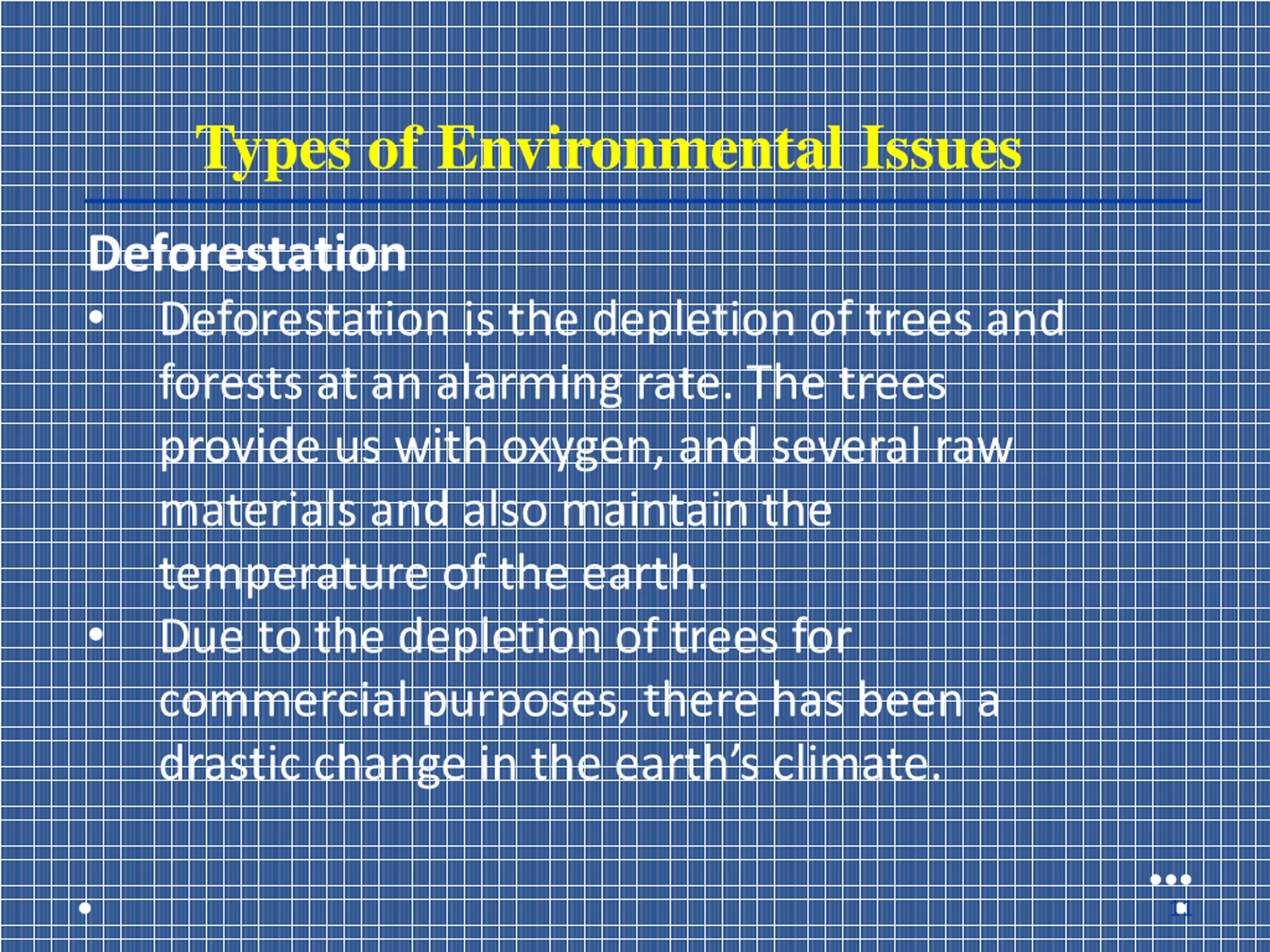 Types of Environmental Issues Deforestation Deforestation is the depletion of trees and forests at an alarming rate. The trees provide us with oxygen, and several raw materials and also maintain the temperature of the earth. Due to the depletion of trees for commercial purposes, there has been a drastic change in the earth s climate. 11