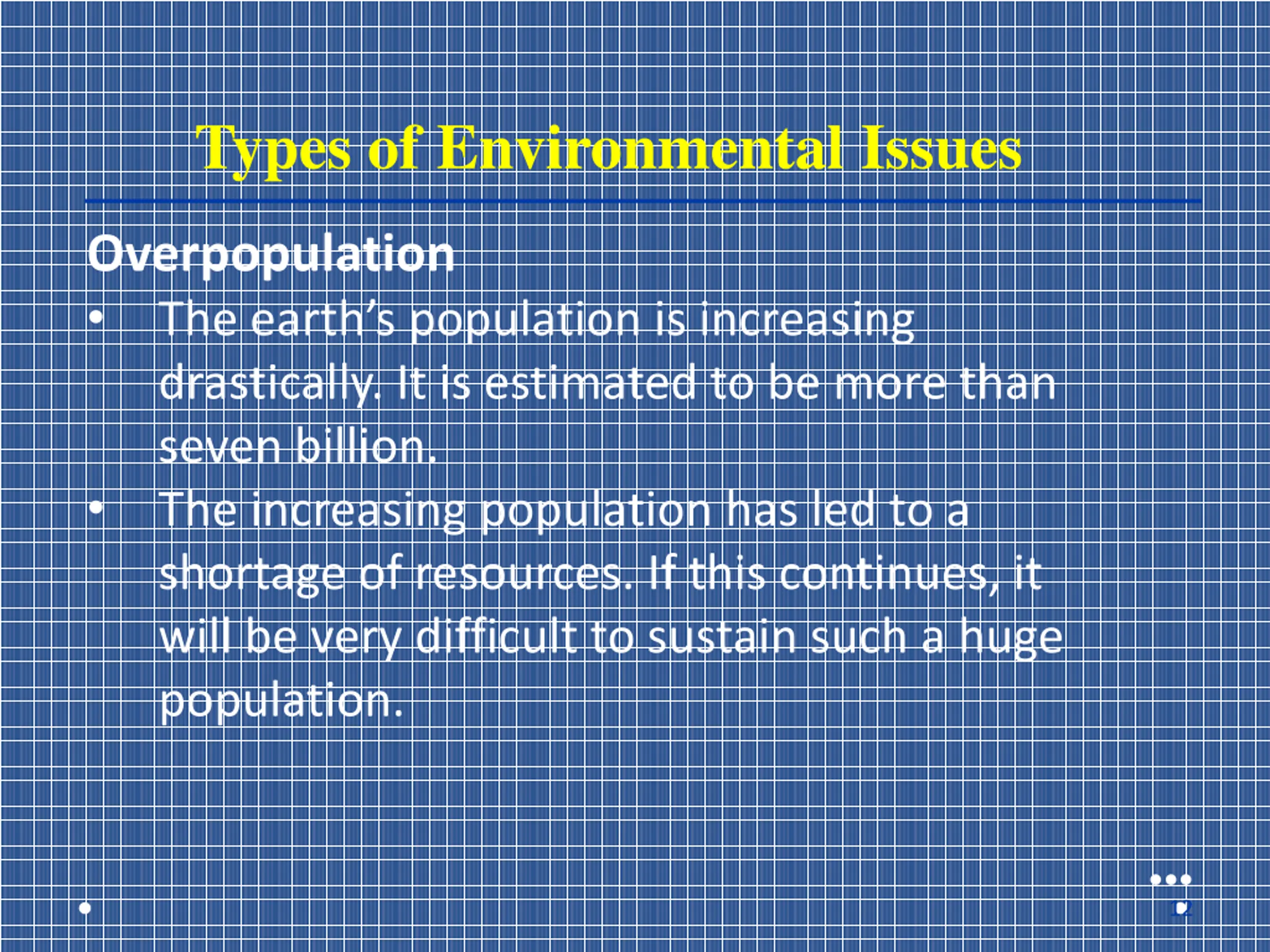Types of Environmental Issues Overpopulation The earth s population is increasing drastically. It is estimated to be more than seven billion. The increasing population has led to a shortage of resources. If this continues, it will be very difficult to sustain such a huge population. 12