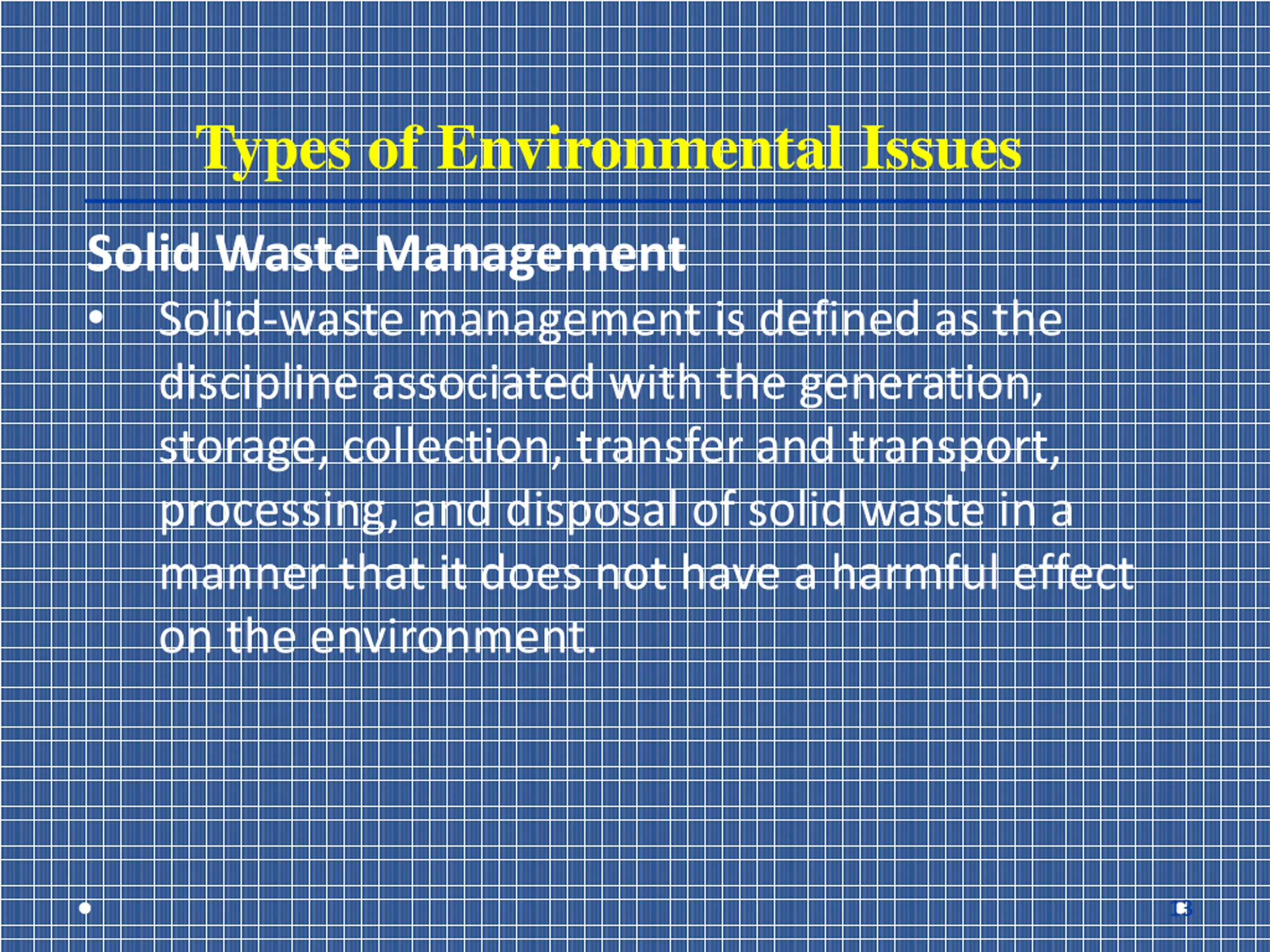 Types of Environmental Issues Solid Waste Management Solid-waste management is defined as the discipline associated with the generation, storage, collection, transfer and transport, processing, and disposal of solid waste in a manner that it does not have a harmful effect on the environment. 13