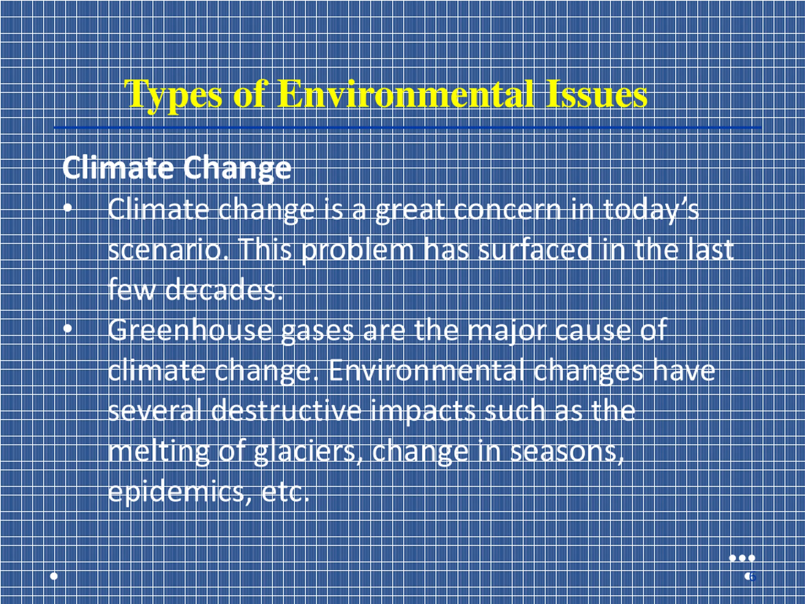 Types of Environmental Issues Climate Change Climate change is a great concern in today s scenario. This problem has surfaced in the last few decades. Greenhouse gases are the major cause of climate change. Environmental changes have several destructive impacts such as the melting of glaciers, change in seasons, epidemics, etc. 6