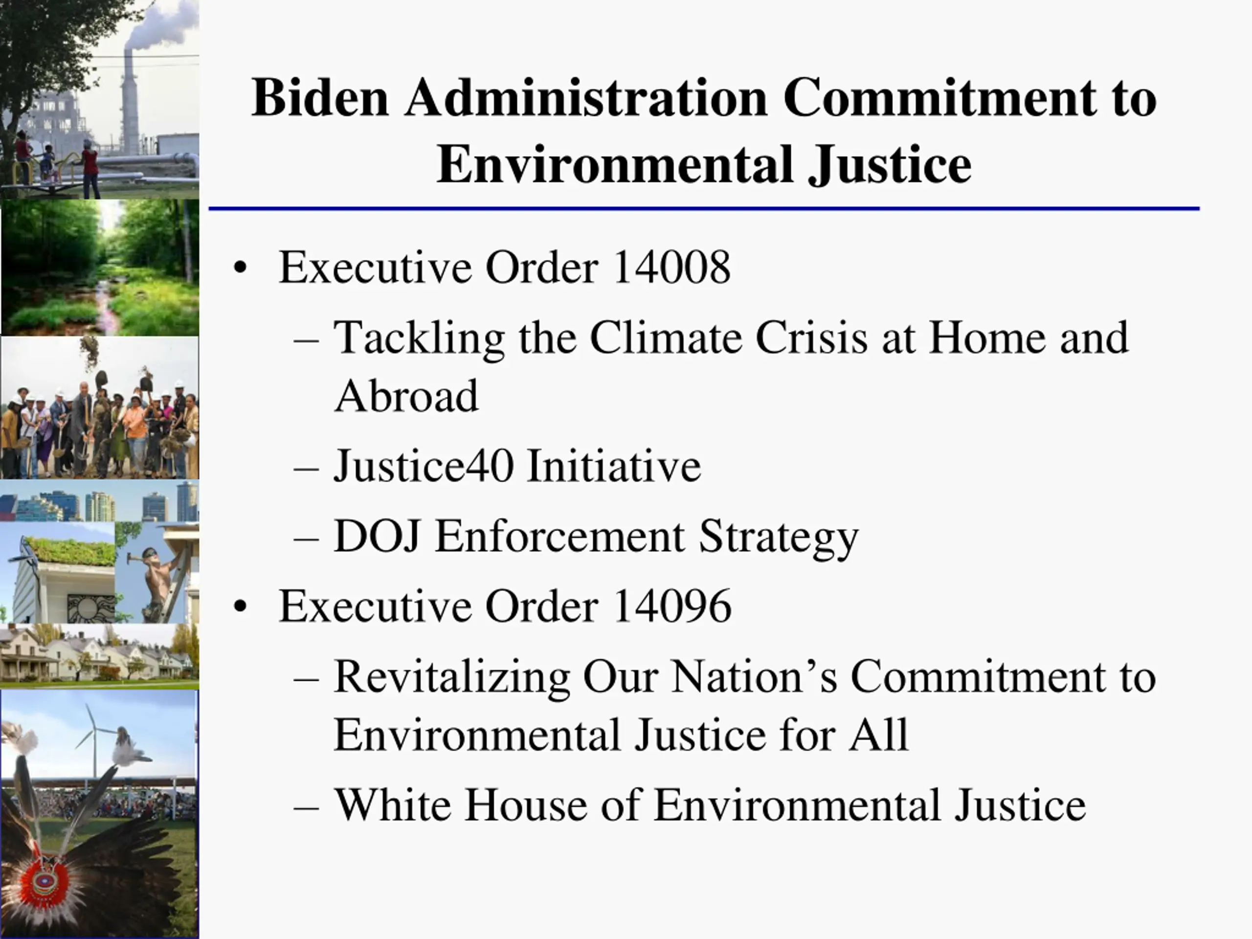 Biden Administration Commitment to Environmental Justice Executive Order 14008 Tackling the Climate Crisis at Home and Abroad Justice40 Initiative DOJ Enforcement Strategy Executive Order 14096 Revitalizing Our Nation s Commitment to Environmental Justice for All White House of Environmental Justice
