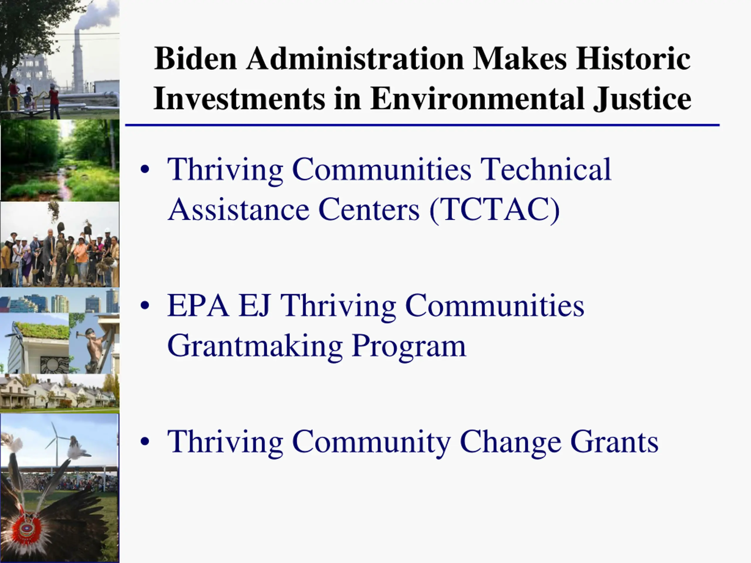 Biden Administration Makes Historic Investments in Environmental Justice Thriving Communities Technical Assistance Centers (TCTAC) EPA EJ Thriving Communities Grantmaking Program Thriving Community Change Grants