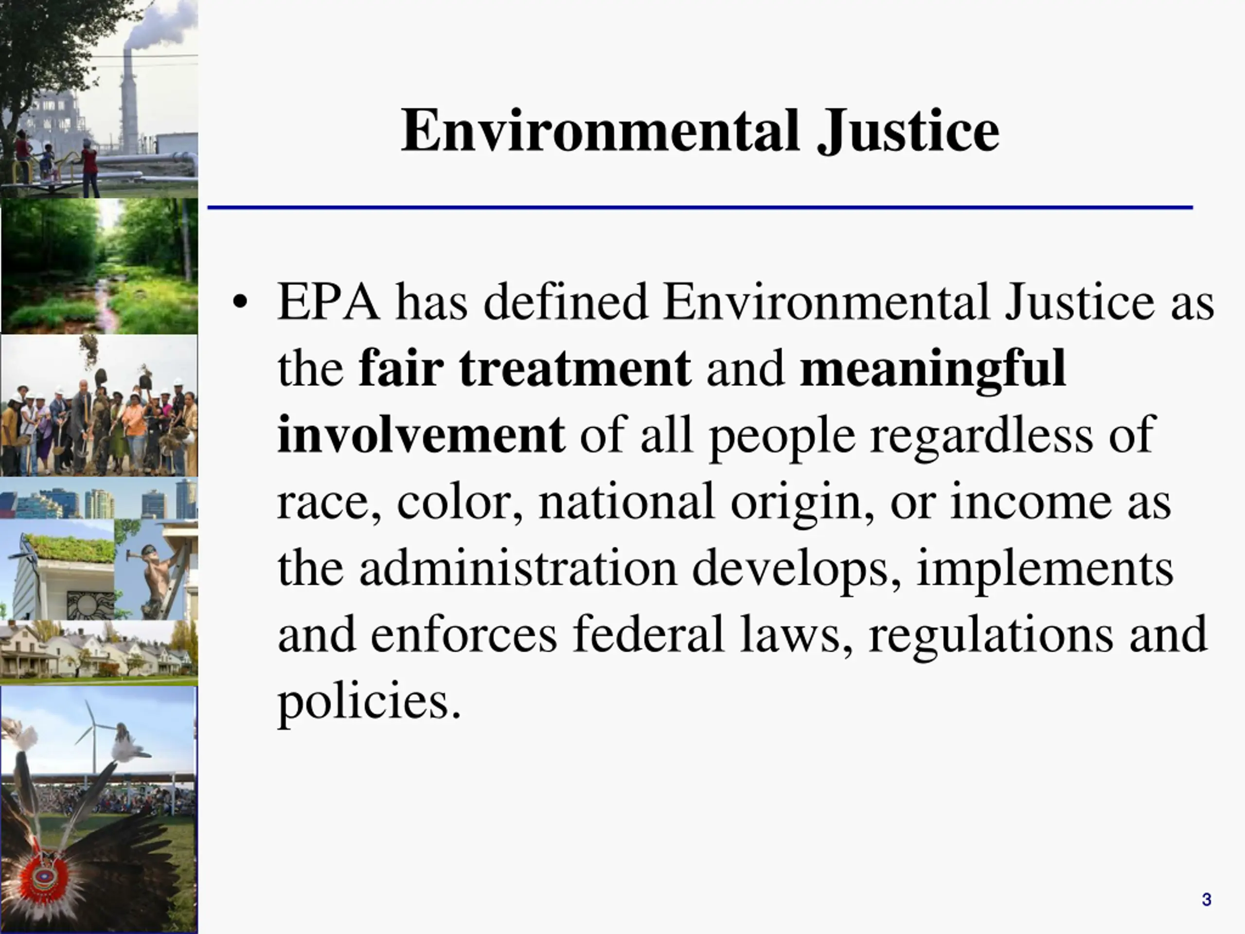 Environmental Justice EPA has defined Environmental Justice as the fair treatment and meaningful involvement of all people regardless of race, color, national origin, or income as the administration develops, implements and enforces federal laws, regulations and policies. 3 3