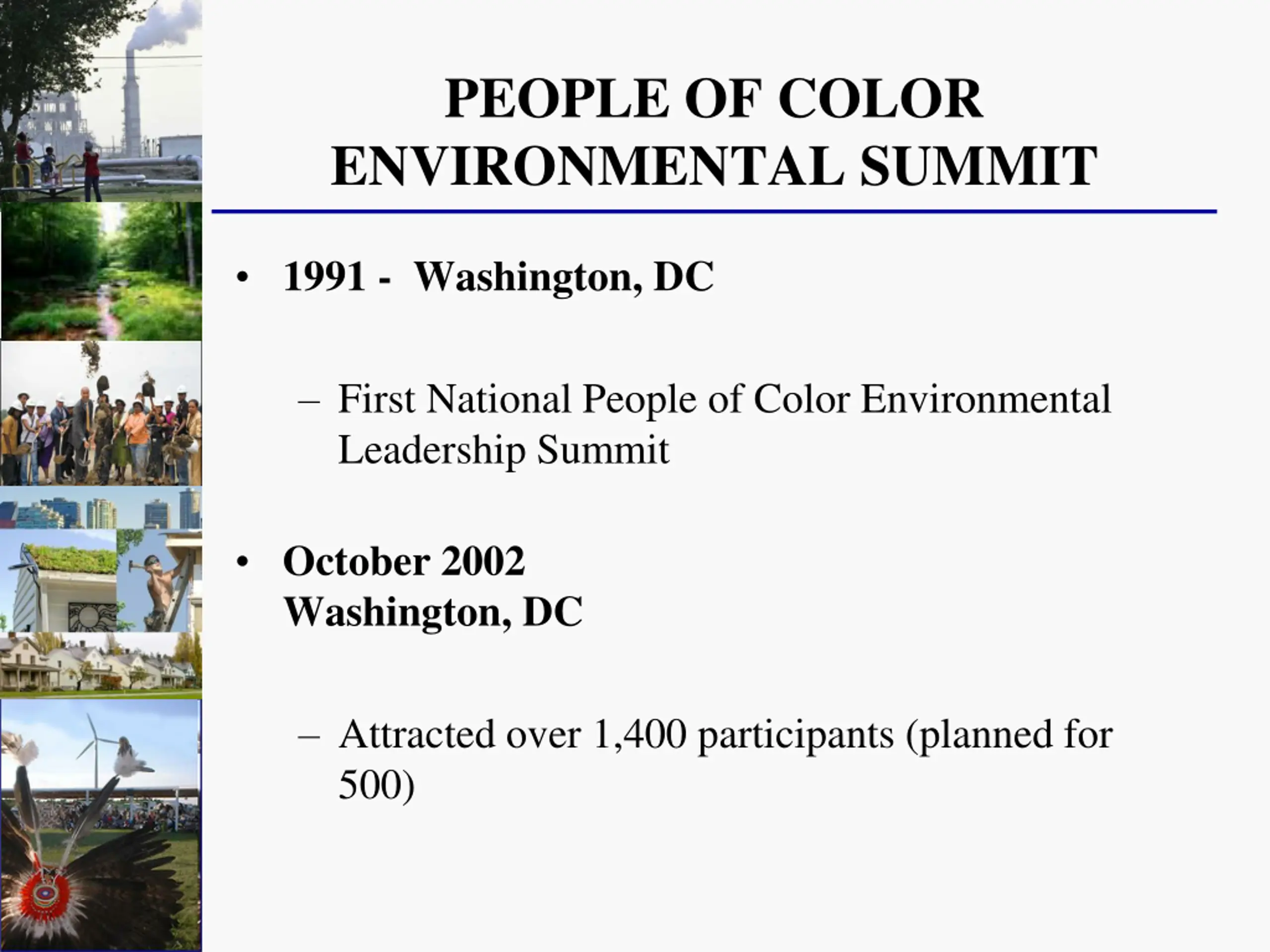 PEOPLE OF COLOR ENVIRONMENTAL SUMMIT 1991 - Washington, DC First National People of Color Environmental Leadership Summit October 2002 Washington, DC Attracted over 1,400 participants (planned for 500)