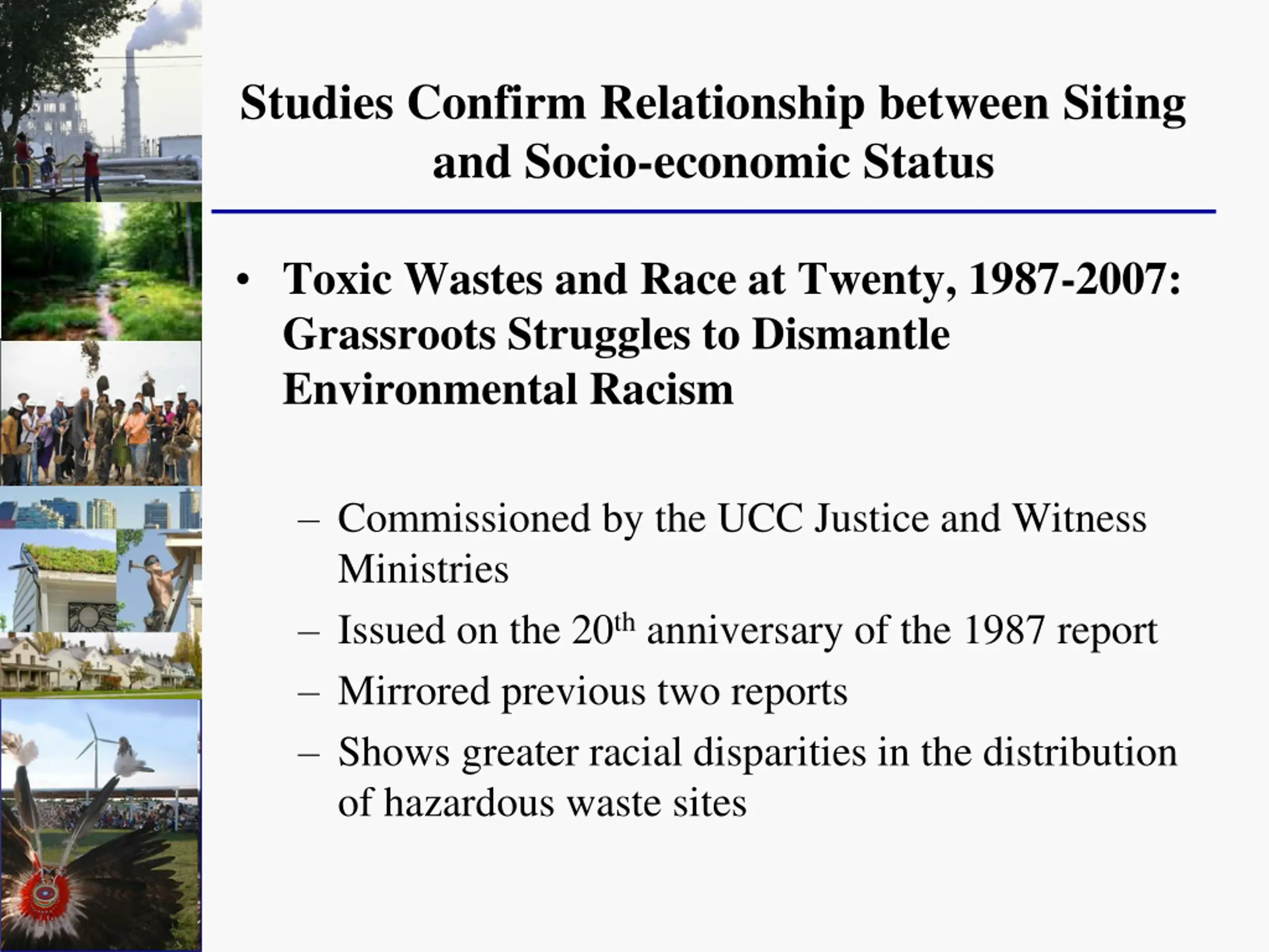 Studies Confirm Relationship between Siting and Socio-economic Status Toxic Wastes and Race at Twenty, 1987-2007: Grassroots Struggles to Dismantle Environmental Racism Commissioned by the UCC Justice and Witness Ministries Issued on the 20th anniversary of the 1987 report Mirrored previous two reports Shows greater racial disparities in the distribution of hazardous waste sites