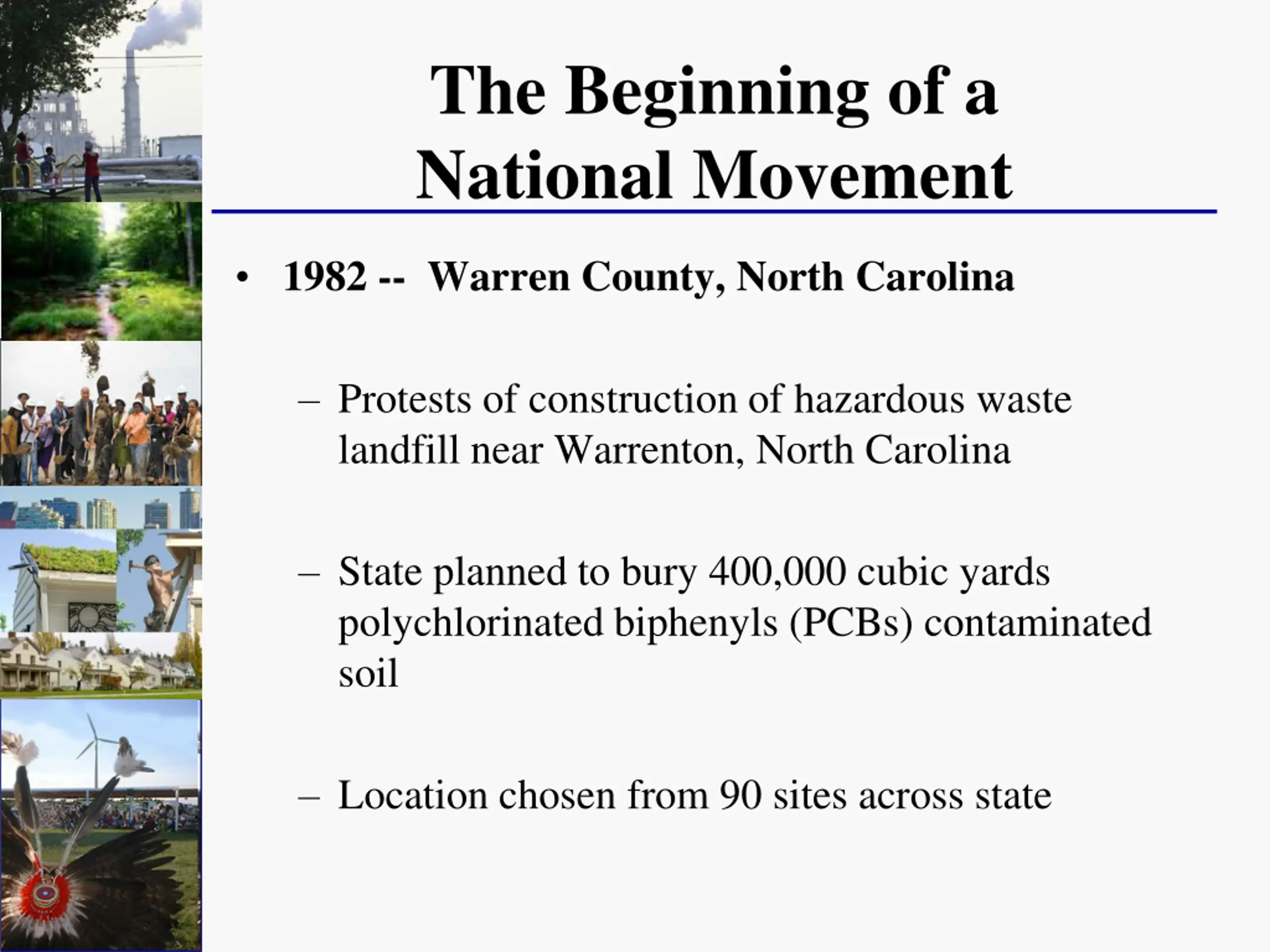 The Beginning of a National Movement 1982 -- Warren County, North Carolina Protests of construction of hazardous waste landfill near Warrenton, North Carolina State planned to bury 400,000 cubic yards polychlorinated biphenyls (PCBs) contaminated soil Location chosen from 90 sites across state