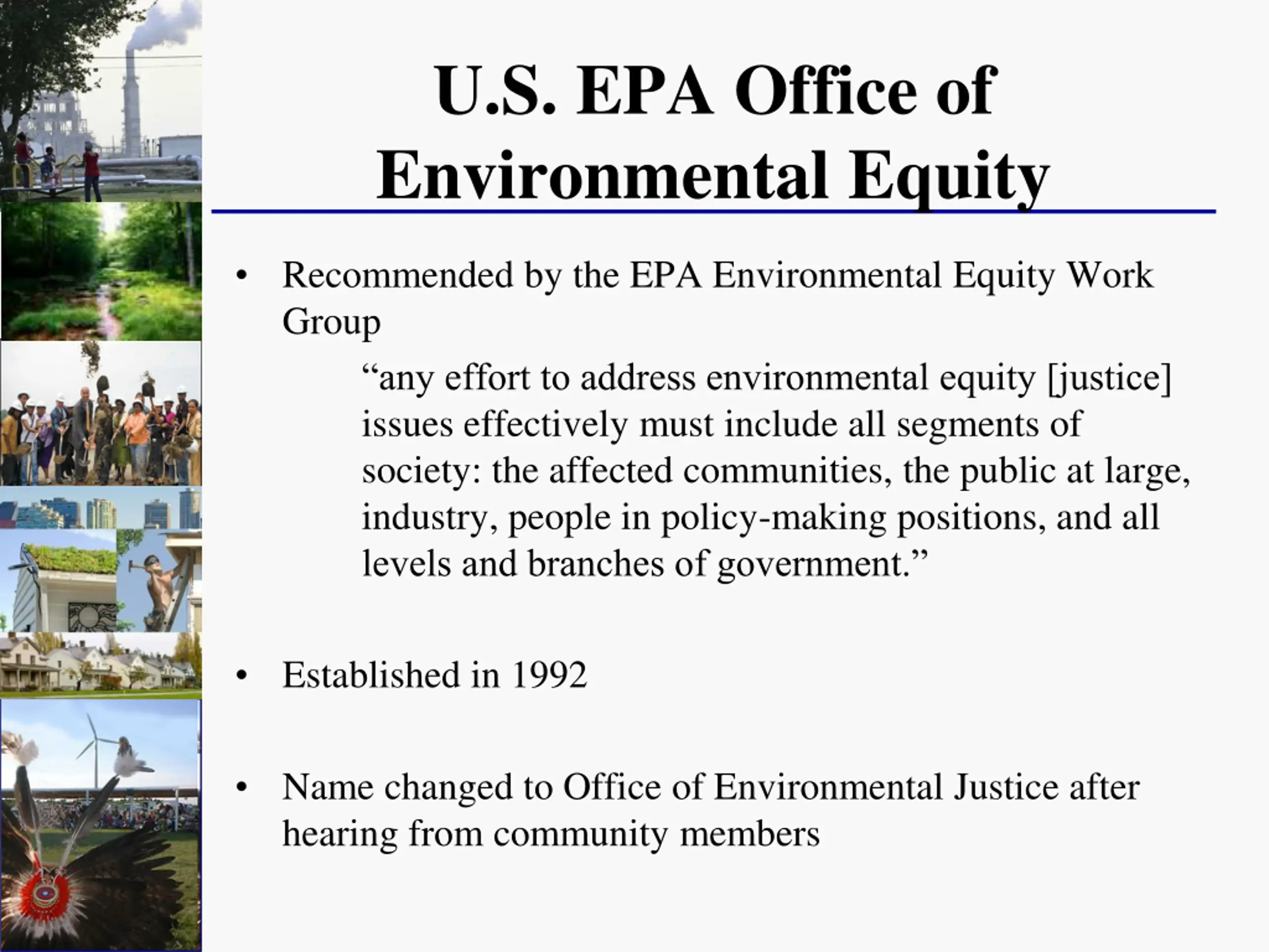 U.S. EPA Office of Environmental Equity Recommended by the EPA Environmental Equity Work Group any effort to address environmental equity [justice] issues effectively must include all segments of society: the affected communities, the public at large, industry, people in policy-making positions, and all levels and branches of government. Established in 1992 Name changed to Office of Environmental Justice after hearing from community members