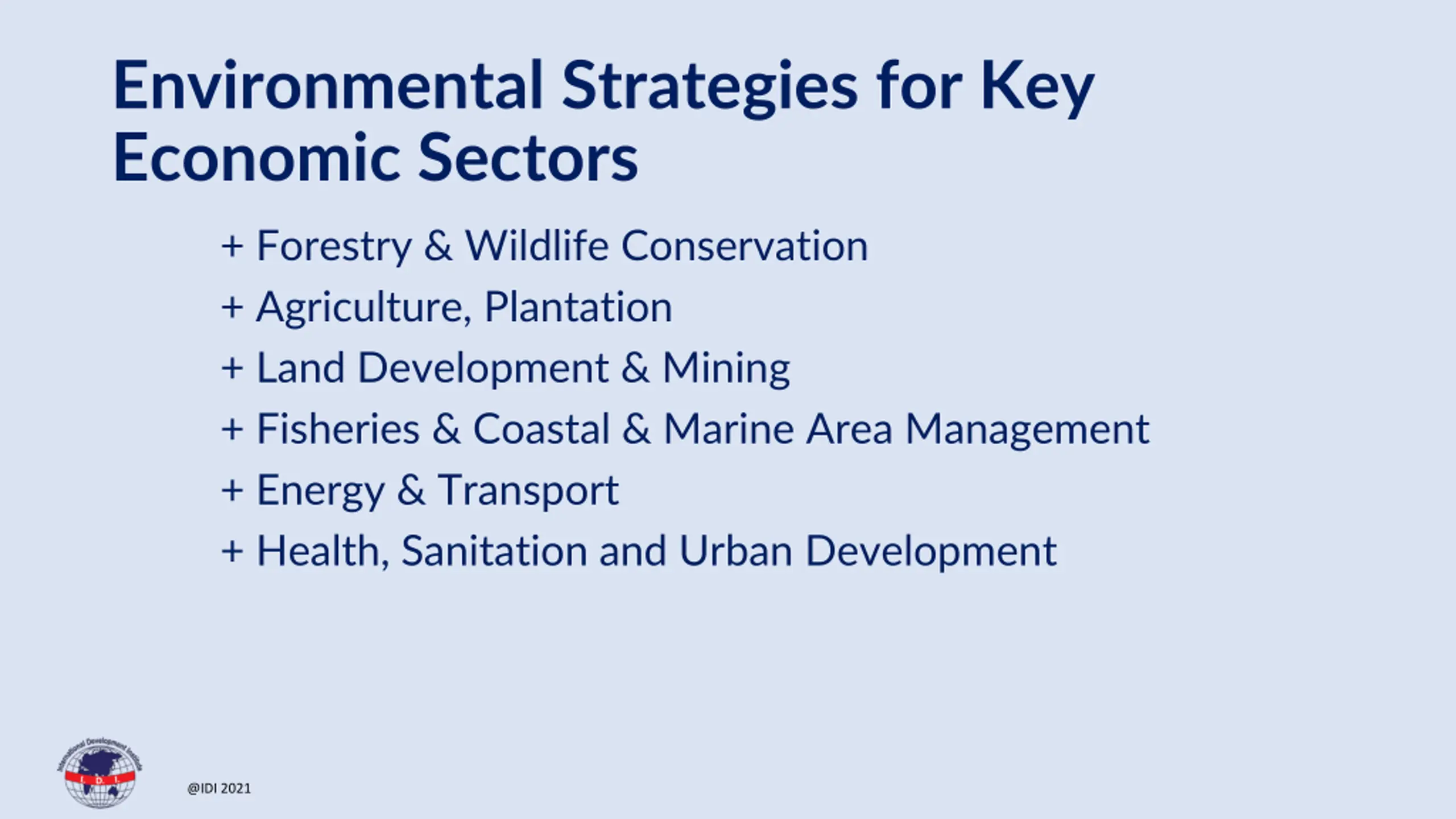 Environmental Strategies for Key Economic Sectors + Forestry & Wildlife Conservation + Agriculture, Plantation + Land Development & Mining + Fisheries & Coastal & Marine Area Management + Energy & Transport + Health, Sanitation and Urban Development @IDI 2021