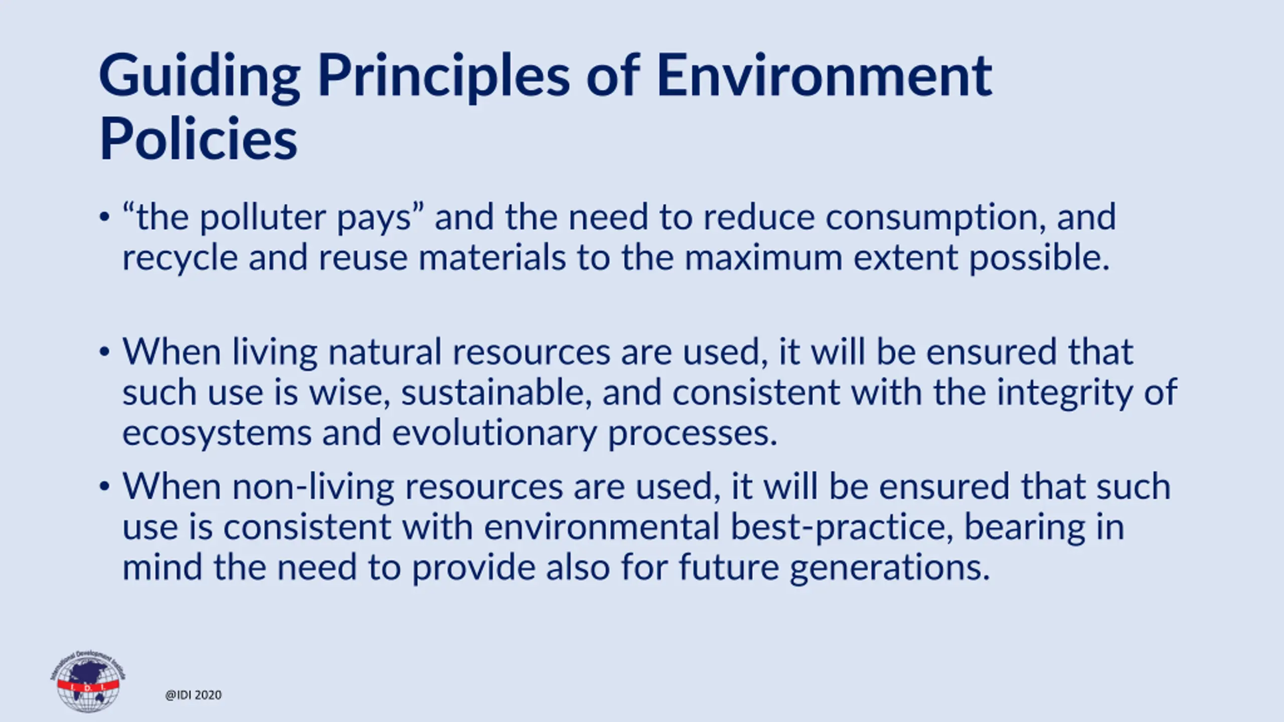 Guiding Principles of Environment Policies the polluter pays and the need to reduce consumption, and recycle and reuse materials to the maximum extent possible. When living natural resources are used, it will be ensured that such use is wise, sustainable, and consistent with the integrity of ecosystems and evolutionary processes. When non-living resources are used, it will be ensured that such use is consistent with environmental best-practice, bearing in mind the need to provide also for future generations. @IDI 2020