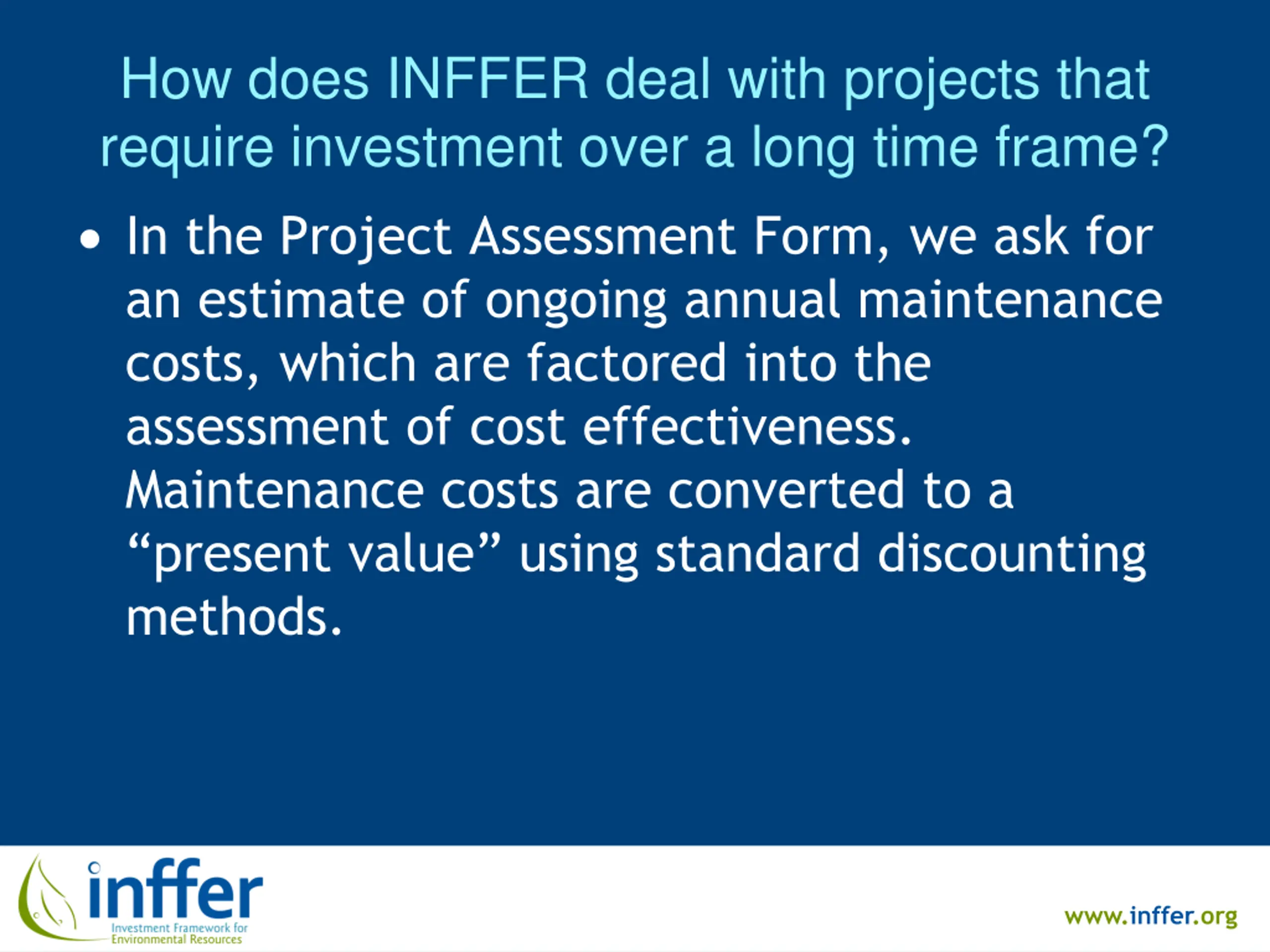 How does INFFER deal with projects that require investment over a long time frame? In the Project Assessment Form, we ask for an estimate of ongoing annual maintenance costs, which are factored into the assessment of cost effectiveness. Maintenance costs are converted to a present value using standard discounting methods. www.inffer.org
