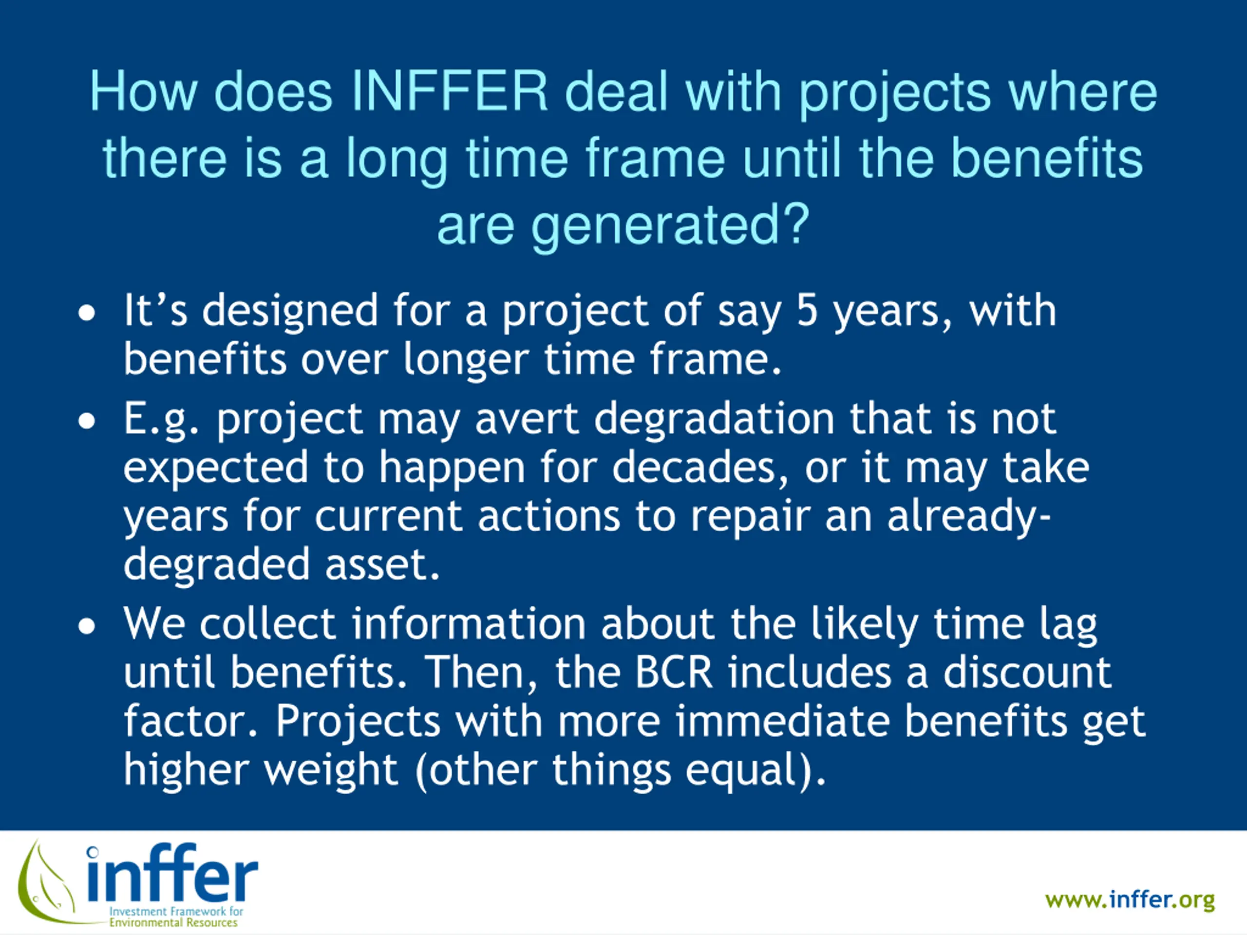 How does INFFER deal with projects where there is a long time frame until the benefits are generated? It s designed for a project of say 5 years, with benefits over longer time frame. E.g. project may avert degradation that is not expected to happen for decades, or it may take years for current actions to repair an already- degraded asset. We collect information about the likely time lag until benefits. Then, the BCR includes a discount factor. Projects with more immediate benefits get higher weight (other things equal). www.inffer.org