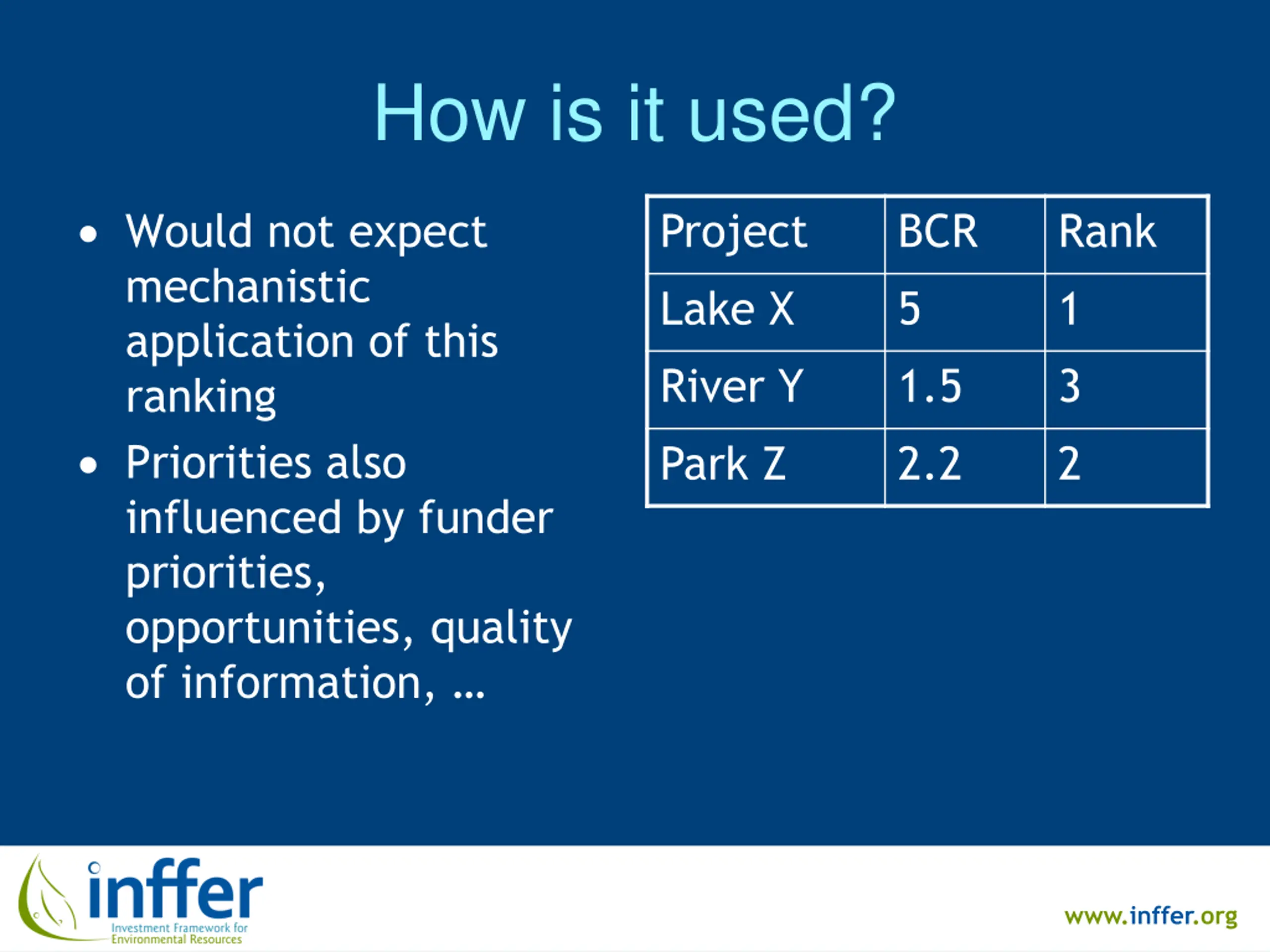 How is it used? Would not expect mechanistic application of this ranking Priorities also influenced by funder priorities, opportunities, quality of information, Project BCR Rank Lake X 5 1 River Y 1.5 3 Park Z 2.2 2 www.inffer.org