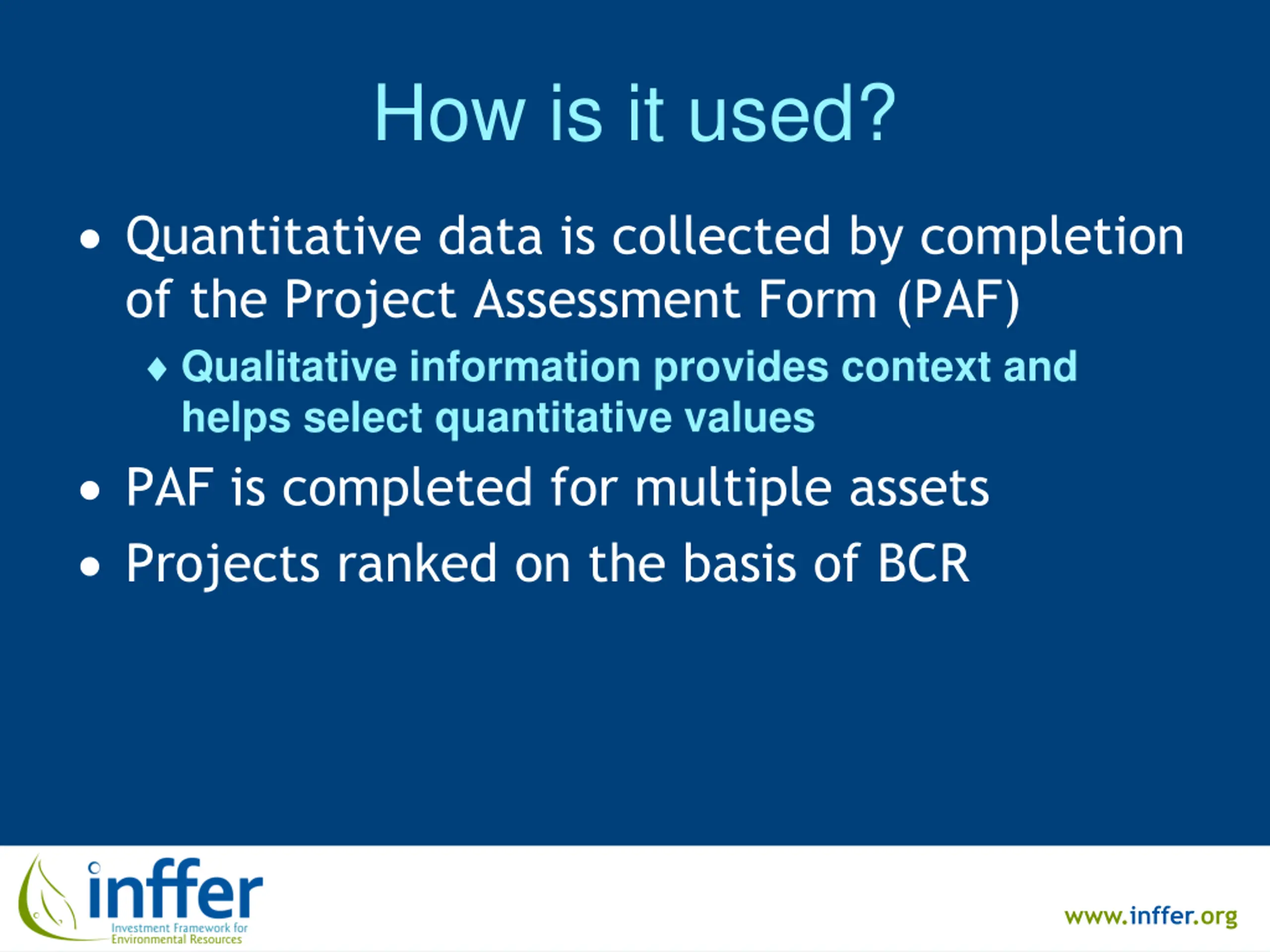 How is it used? Quantitative data is collected by completion of the Project Assessment Form (PAF) Qualitative information provides context and helps select quantitative values PAF is completed for multiple assets Projects ranked on the basis of BCR www.inffer.org