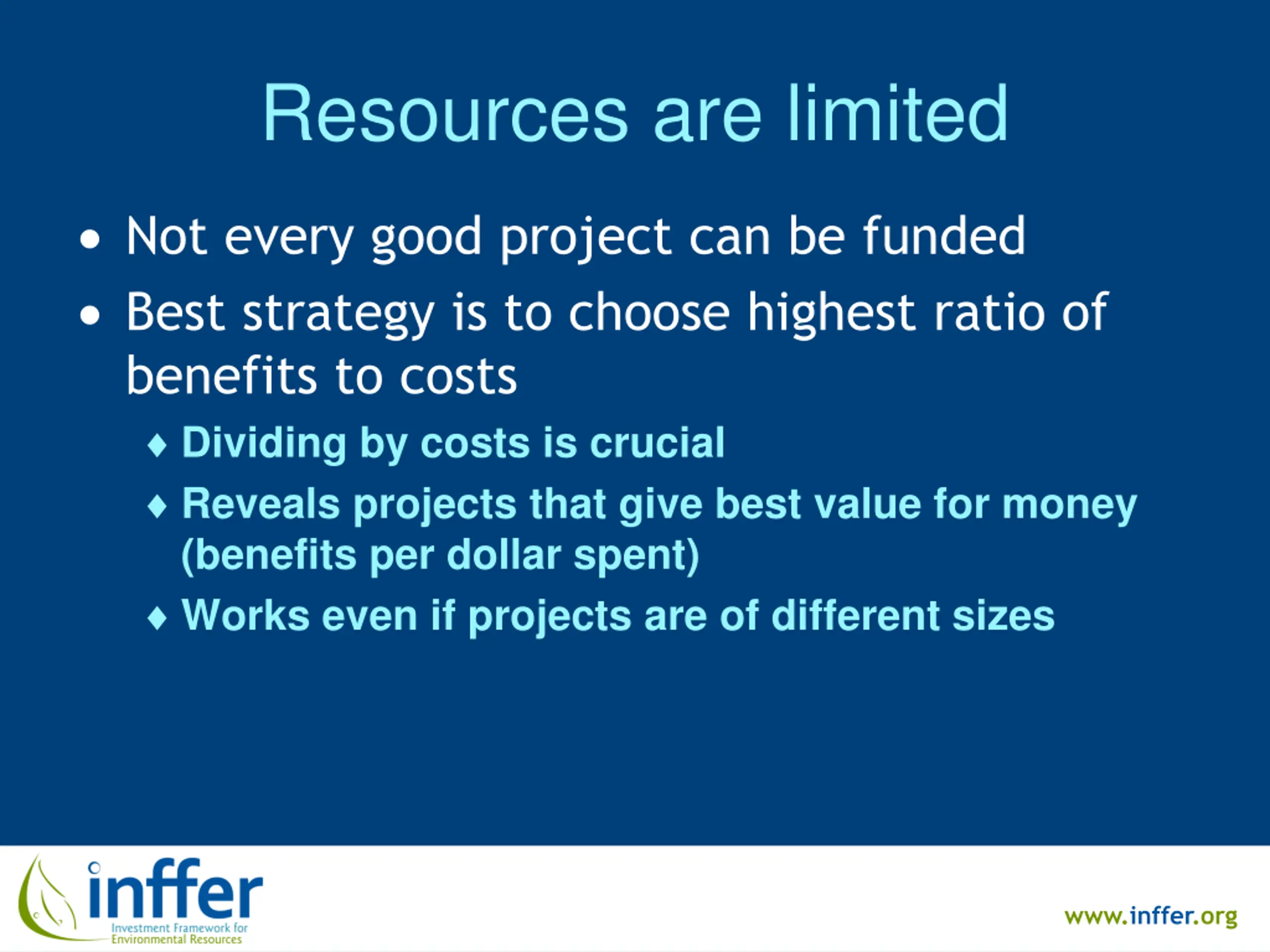 Resources are limited Not every good project can be funded Best strategy is to choose highest ratio of benefits to costs Dividing by costs is crucial Reveals projects that give best value for money (benefits per dollar spent) Works even if projects are of different sizes www.inffer.org
