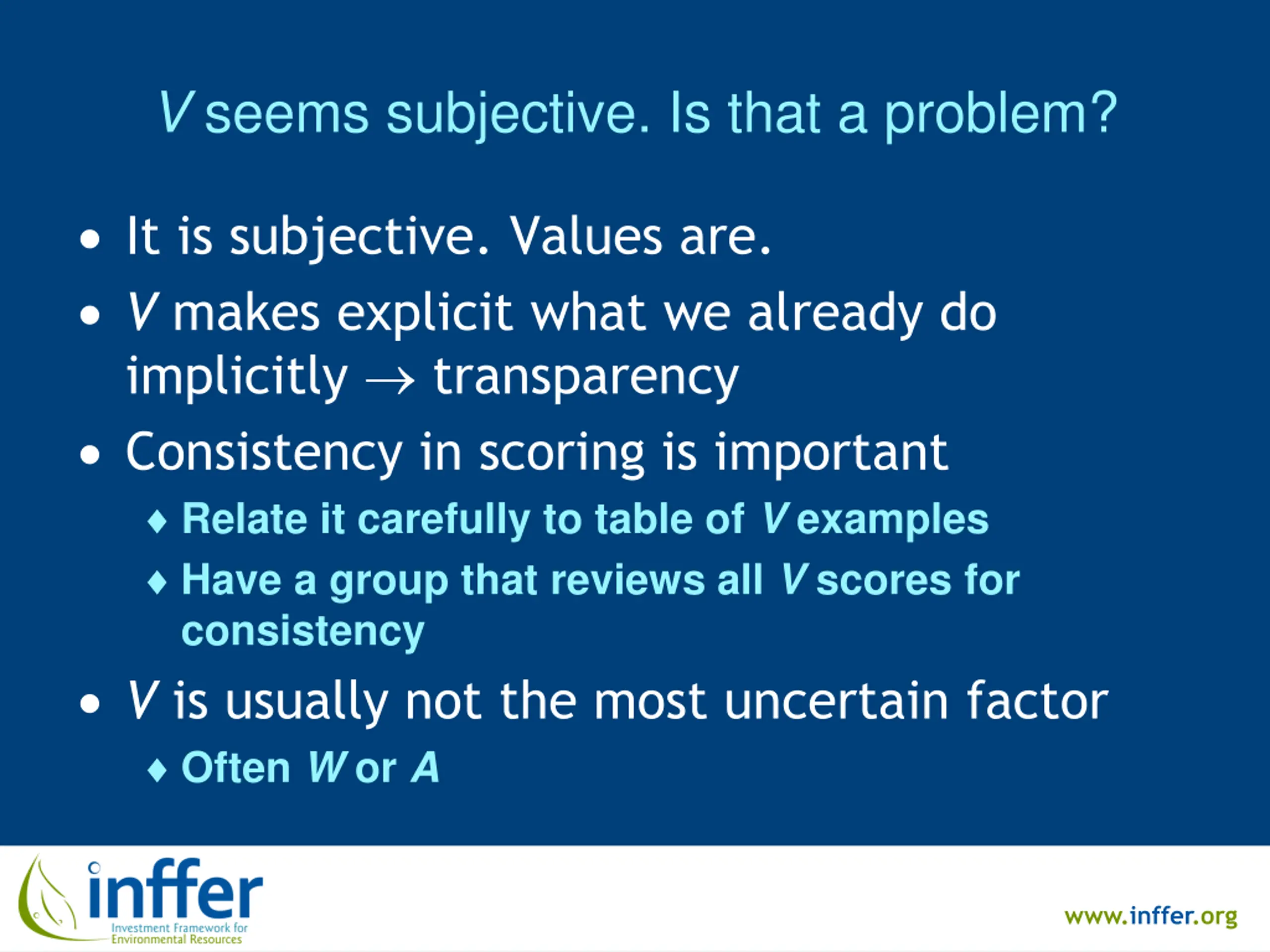 V seems subjective. Is that a problem? It is subjective. Values are. V makes explicit what we already do implicitly transparency Consistency in scoring is important Relate it carefully to table of V examples Have a group that reviews all V scores for consistency V is usually not the most uncertain factor Often W or A www.inffer.org