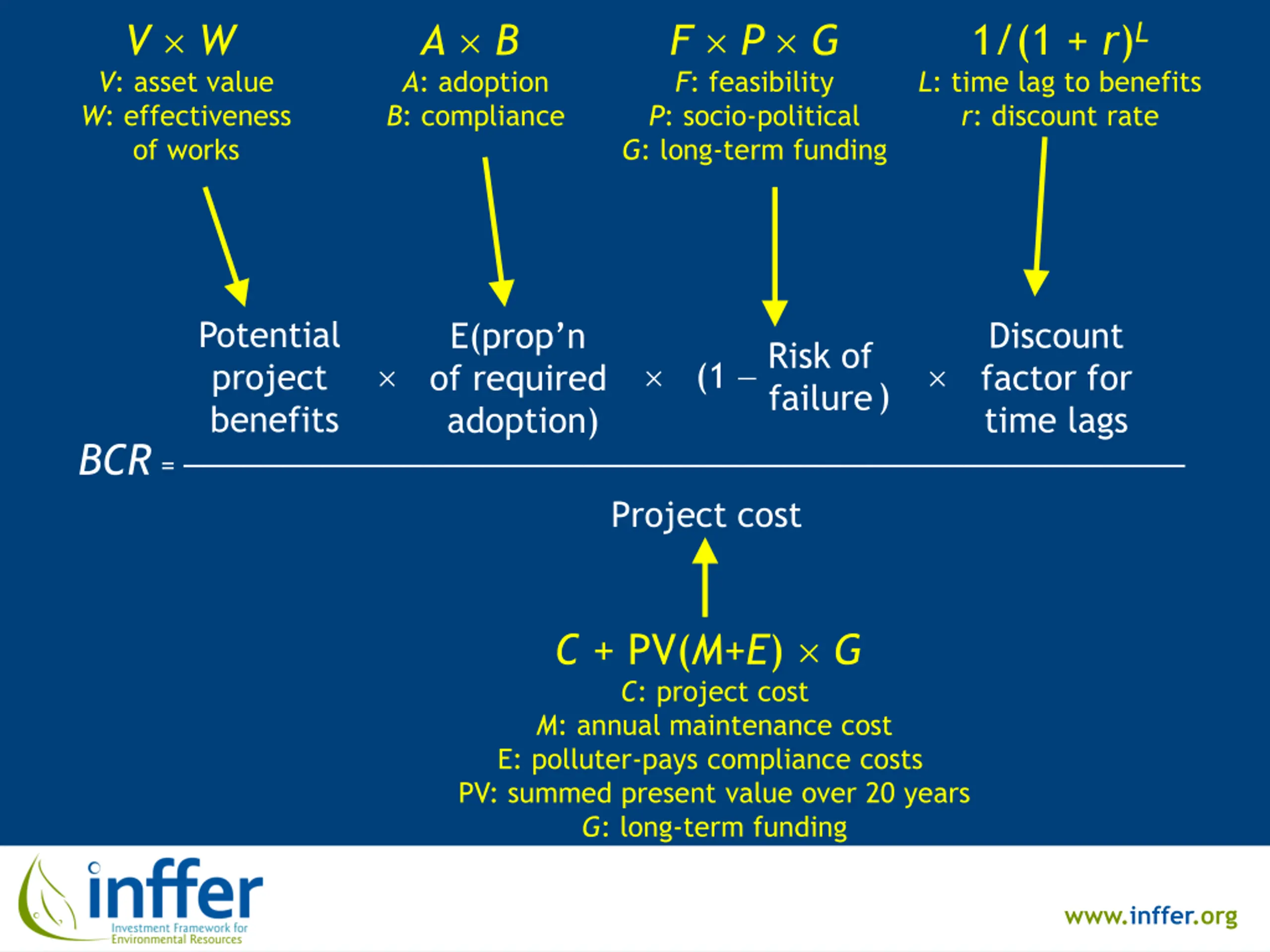 VW V: asset value W: effectiveness of works A B A: adoption B: compliance F P G F: feasibility P: socio-political G: long-term funding 1/(1 + r)L L: time lag to benefits r: discount rate Potential project benefits Discount factor for time lags E(prop n of required adoption) (1 Risk of ) failure BCR = Project cost C + PV(M+E) G C: project cost M: annual maintenance cost E: polluter-pays compliance costs PV: summed present value over 20 years G: long-term funding www.inffer.org