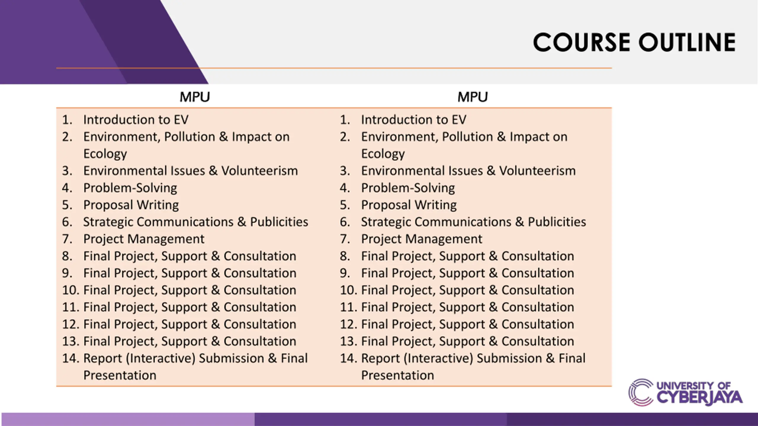 COURSE OUTLINE MPU MPU MPU MPU 1. Introduction to EV 2. Environment, Pollution & Impact on Ecology 3. Environmental Issues & Volunteerism 4. Problem-Solving 5. Proposal Writing 6. Strategic Communications & Publicities 7. Project Management 8. Final Project, Support & Consultation 9. Final Project, Support & Consultation 10. Final Project, Support & Consultation 11. Final Project, Support & Consultation 12. Final Project, Support & Consultation 13. Final Project, Support & Consultation 14. Report (Interactive) Submission & Final Presentation 1. Introduction to EV 2. Environment, Pollution & Impact on Ecology 3. Environmental Issues & Volunteerism 4. Problem-Solving 5. Proposal Writing 6. Strategic Communications & Publicities 7. Project Management 8. Final Project, Support & Consultation 9. Final Project, Support & Consultation 10. Final Project, Support & Consultation 11. Final Project, Support & Consultation 12. Final Project, Support & Consultation 13. Final Project, Support & Consultation 14. Report (Interactive) Submission & Final Presentation