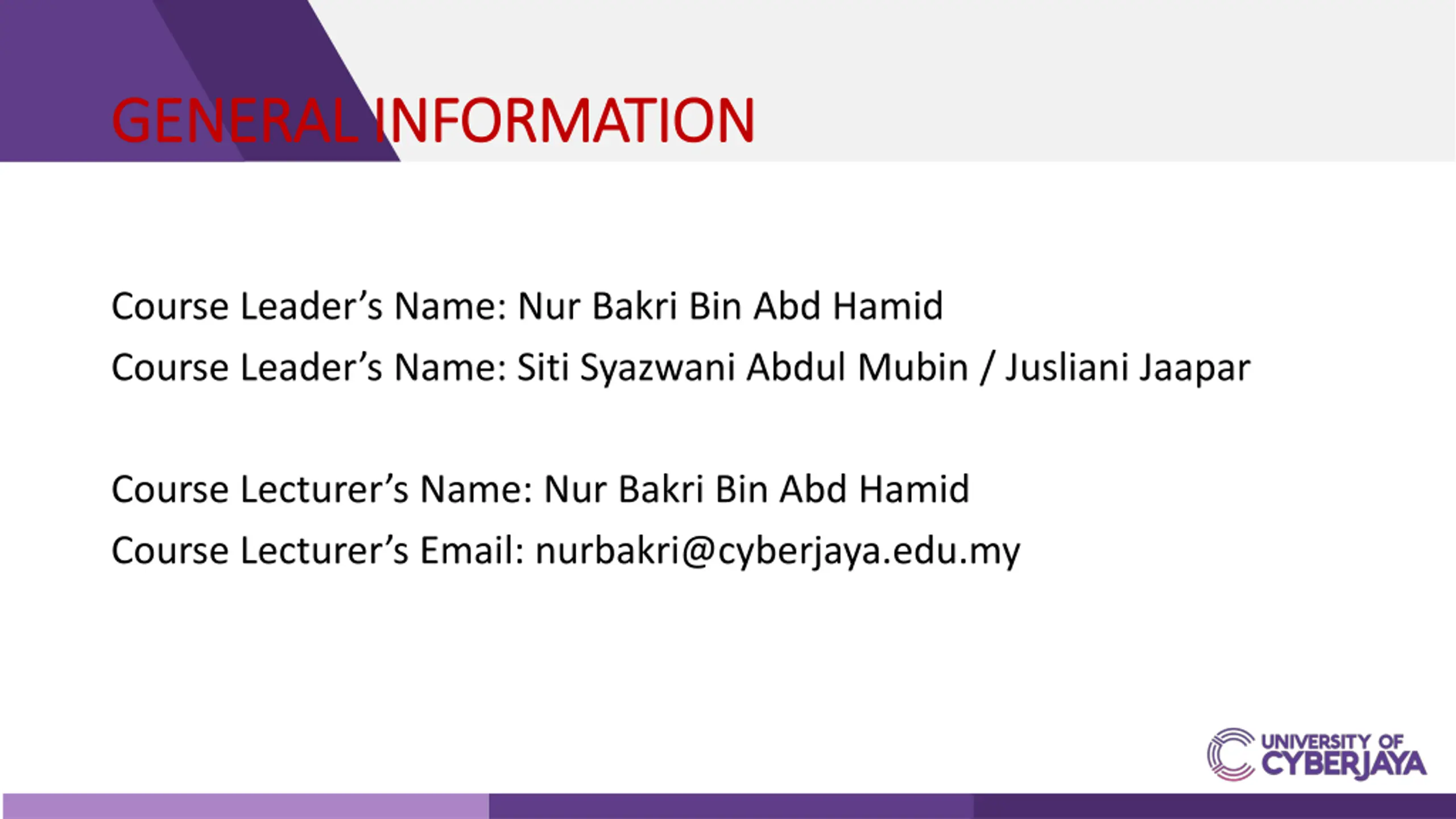 GENERAL INFORMATION GENERAL INFORMATION Course Leader s Name: Nur Bakri Bin Abd Hamid Course Leader s Name: Siti Syazwani Abdul Mubin / Jusliani Jaapar Course Lecturer s Name: Nur Bakri Bin Abd Hamid Course Lecturer s Email: nurbakri@cyberjaya.edu.my