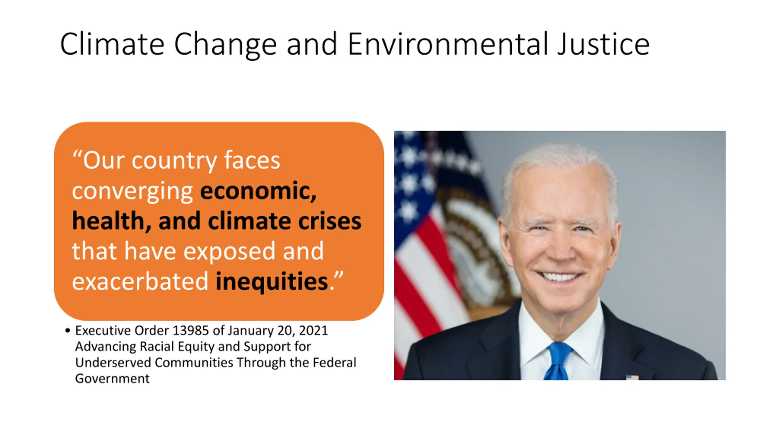 Climate Change and Environmental Justice Our country faces converging economic, health, and climate crises that have exposed and exacerbated inequities. Executive Order 13985 of January 20, 2021 Advancing Racial Equity and Support for Underserved Communities Through the Federal Government