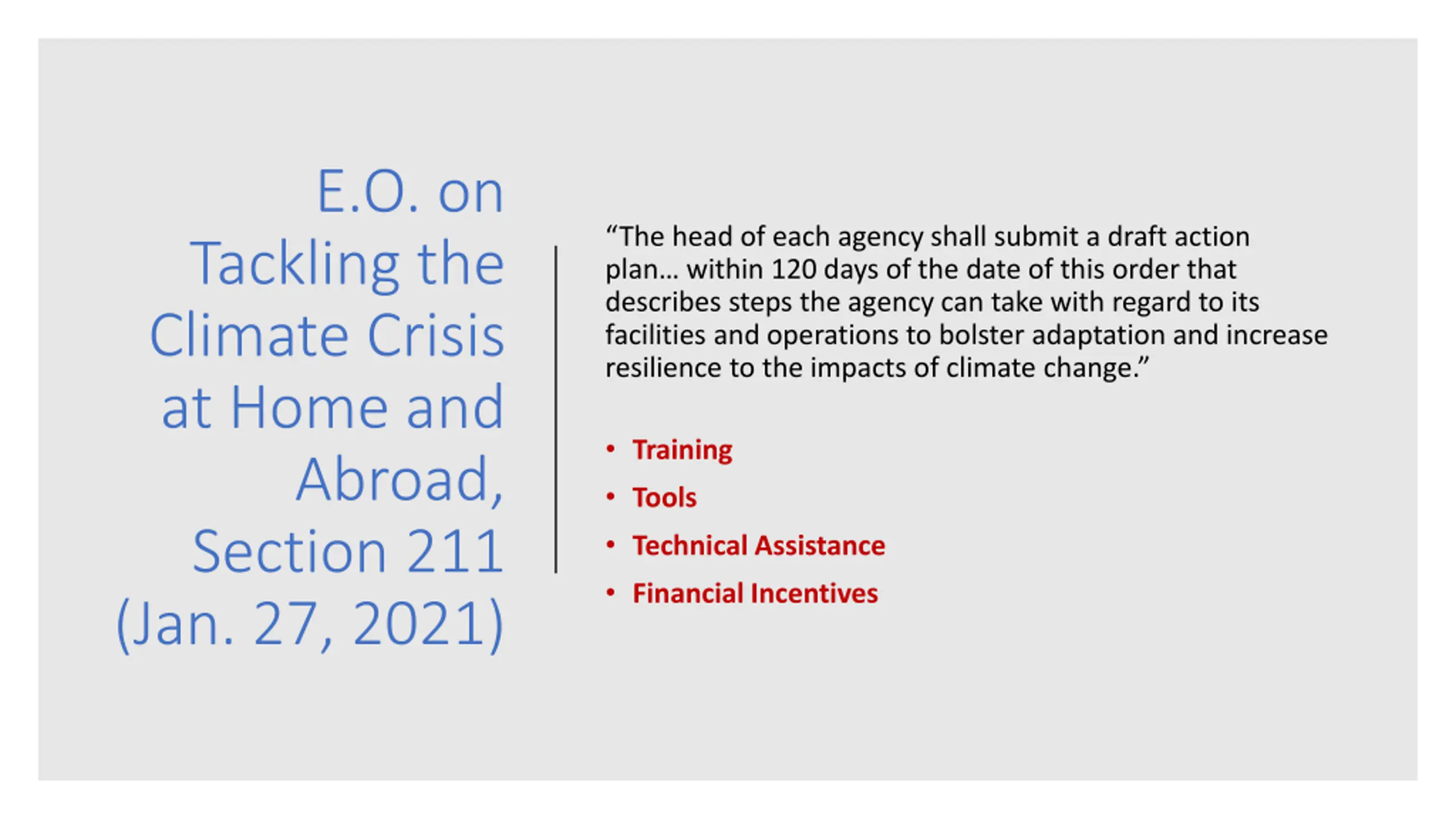 E.O. on The head of each agency shall submit a draft action plan within 120 days of the date of this order that describes steps the agency can take with regard to its facilities and operations to bolster adaptation and increase resilience to the impacts of climate change. Tackling the Climate Crisis at Home and Abroad, Section 211 (Jan. 27, 2021) Training Tools Technical Assistance Financial Incentives