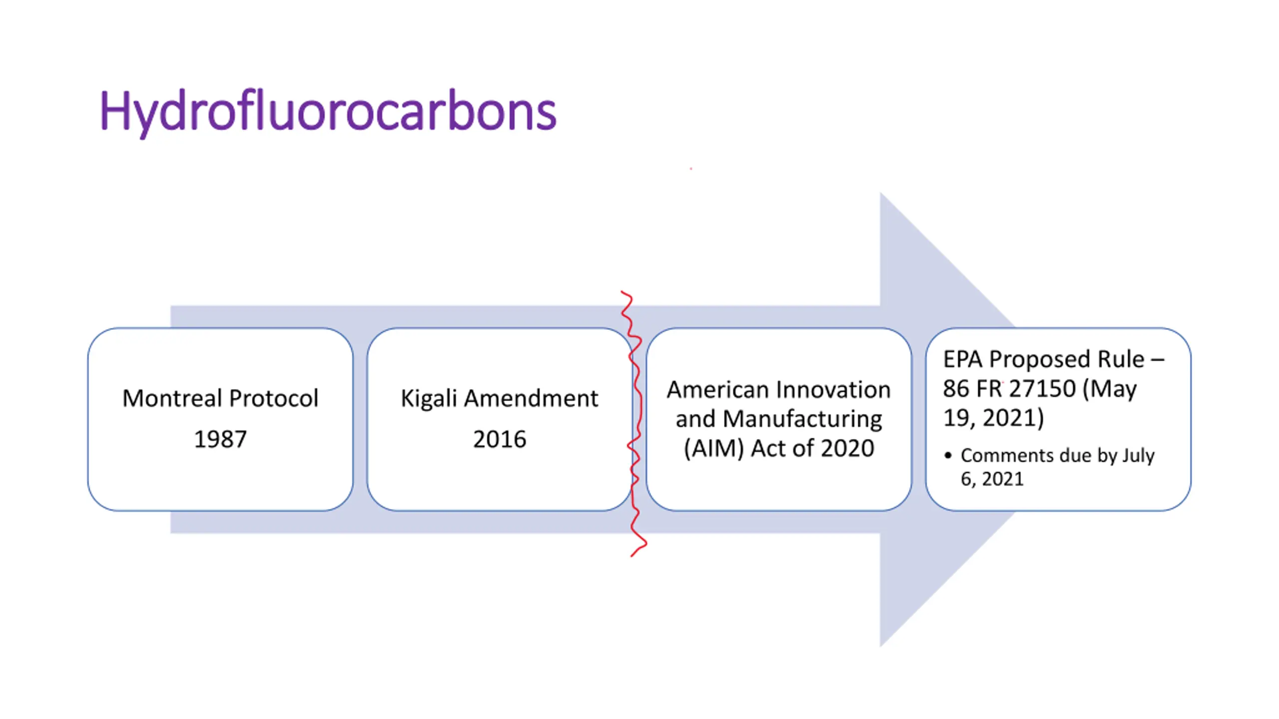 Hydrofluorocarbons Hydrofluorocarbons EPA Proposed Rule 86 FR 27150 (May 19, 2021) American Innovation and Manufacturing (AIM) Act of 2020 Montreal Protocol Kigali Amendment 1987 2016 Comments due by July 6, 2021