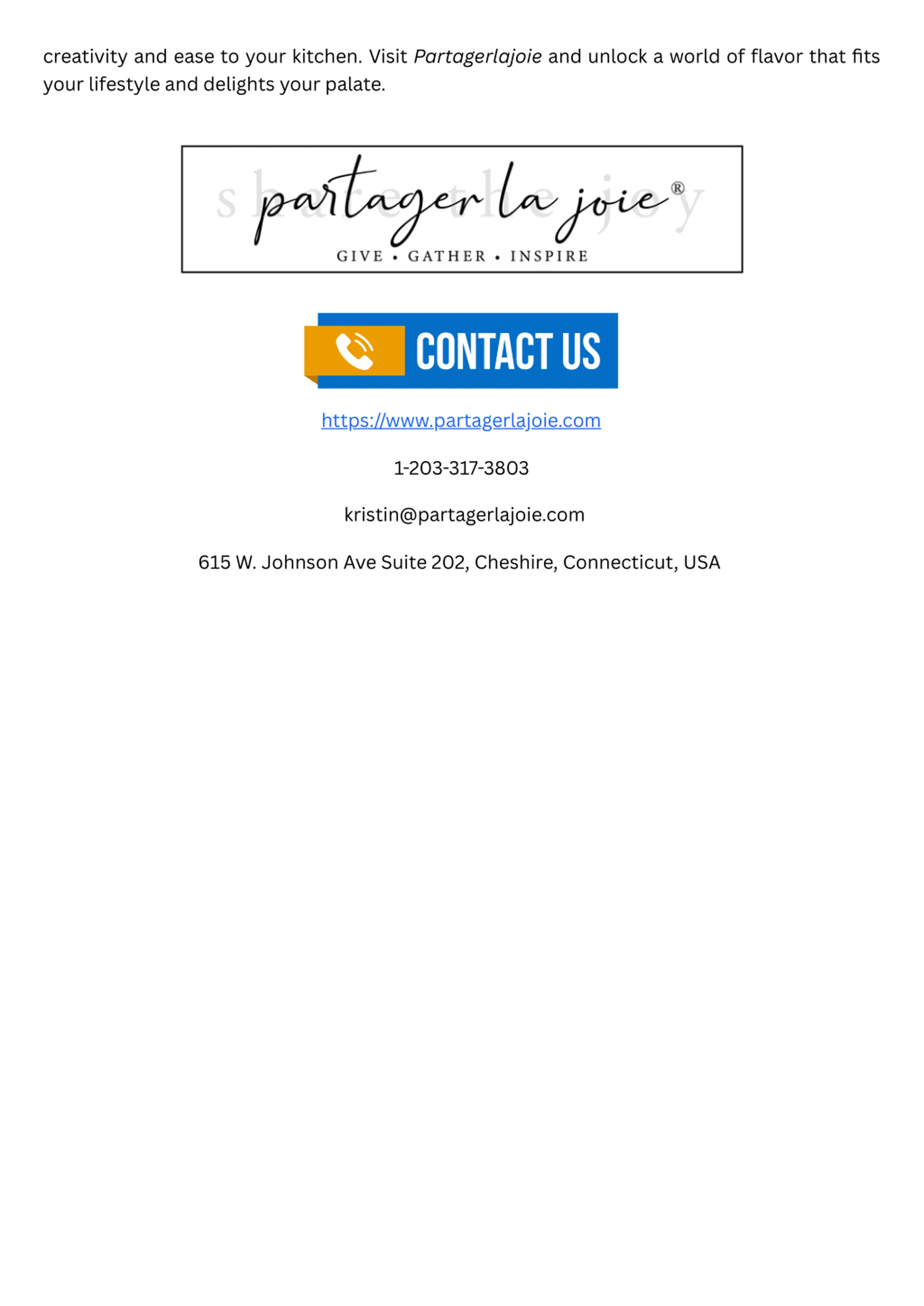 creativity and ease to your kitchen. Visit Partagerlajoie and unlock a world of flavor that fits your lifestyle and delights your palate. https://www.partagerlajoie.com 1-203-317-3803 kristin@partagerlajoie.com 615 W. Johnson Ave Suite 202, Cheshire, Connecticut, USA