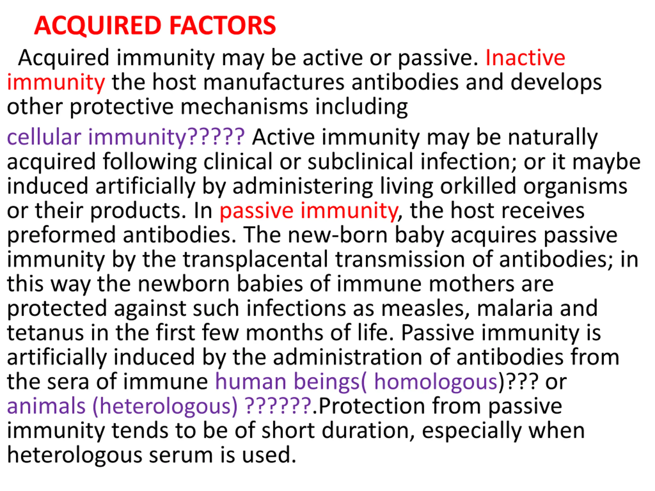 ACQUIRED FACTORS Acquired immunity may be active or passive. Inactive immunity the host manufactures antibodies and develops other protective mechanisms including cellular immunity????? Active immunity may be naturally acquired following clinical or subclinical infection; or it maybe induced artificially by administering living orkilled organisms or their products. In passive immunity, the host receives preformed antibodies. The new-born baby acquires passive immunity by the transplacental transmission of antibodies; in this way the newborn babies of immune mothers are protected against such infections as measles, malaria and tetanus in the first few months of life. Passive immunity is artificially induced by the administration of antibodies from the sera of immune human beings( homologous)??? or animals (heterologous) ??????.Protection from passive immunity tends to be of short duration, especially when heterologous serum is used.