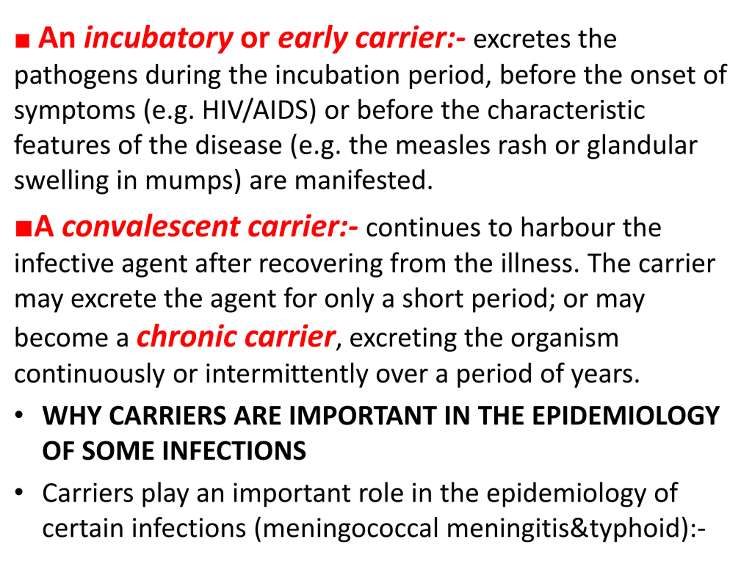 An incubatory or early carrier:- excretes the pathogens during the incubation period, before the onset of symptoms (e.g. HIV/AIDS) or before the characteristic features of the disease (e.g. the measles rash or glandular swelling in mumps) are manifested. A convalescent carrier:- continues to harbour the infective agent after recovering from the illness. The carrier may excrete the agent for only a short period; or may become a chronic carrier, excreting the organism continuously or intermittently over a period of years. WHY CARRIERS ARE IMPORTANT IN THE EPIDEMIOLOGY OF SOME INFECTIONS Carriers play an important role in the epidemiology of certain infections (meningococcal meningitis&typhoid):-