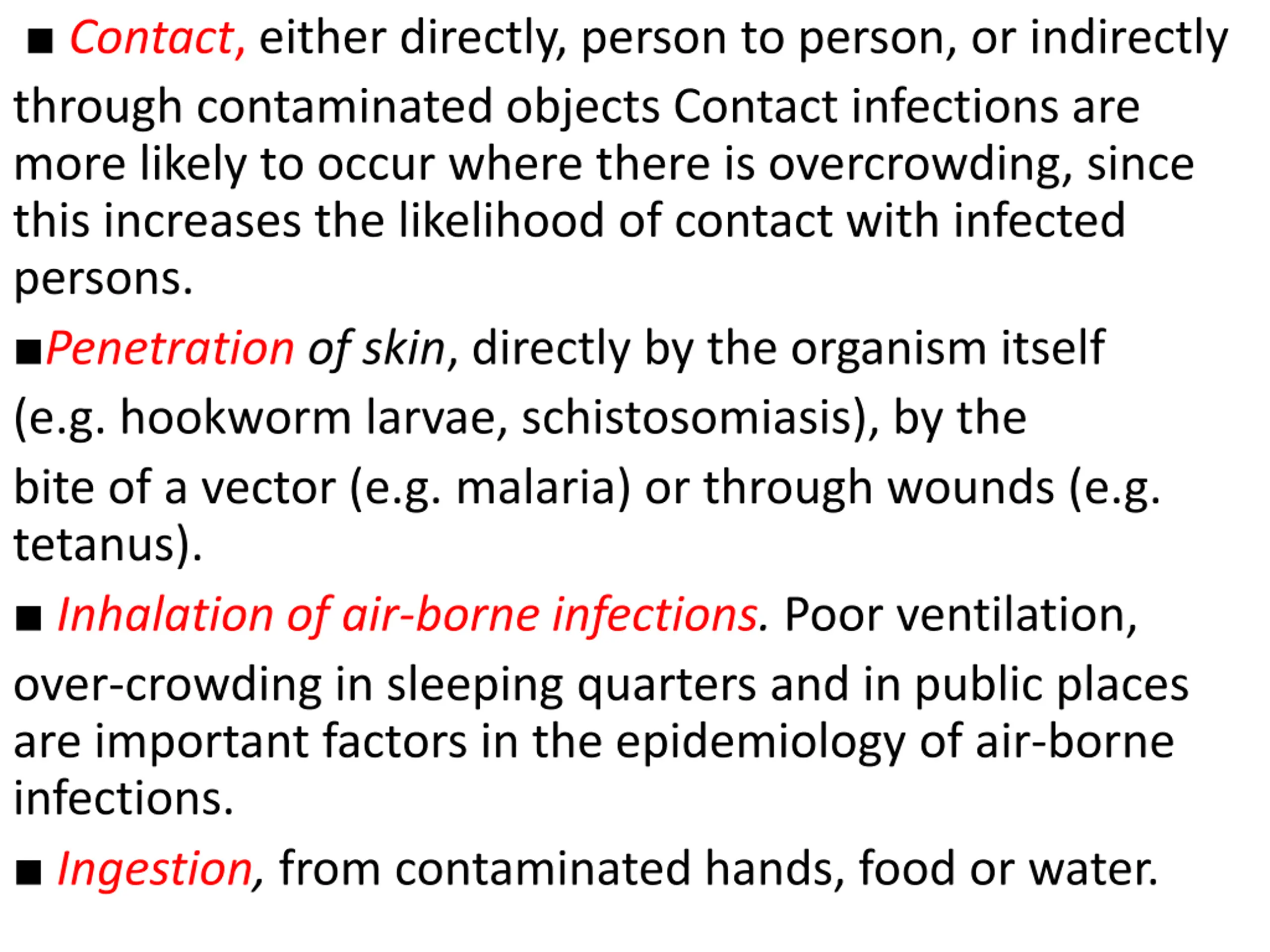 Contact, either directly, person to person, or indirectly through contaminated objects Contact infections are more likely to occur where there is overcrowding, since this increases the likelihood of contact with infected persons. Penetration of skin, directly by the organism itself (e.g. hookworm larvae, schistosomiasis), by the bite of a vector (e.g. malaria) or through wounds (e.g. tetanus). Inhalation of air-borne infections. Poor ventilation, over-crowding in sleeping quarters and in public places are important factors in the epidemiology of air-borne infections. Ingestion, from contaminated hands, food or water.