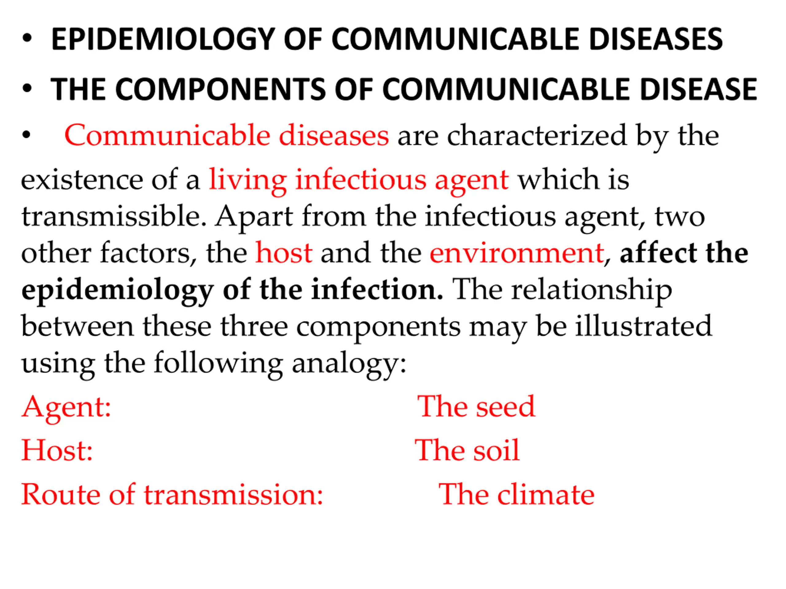 EPIDEMIOLOGY OF COMMUNICABLE DISEASES THE COMPONENTS OF COMMUNICABLE DISEASE Communicable diseases are characterized by the existence of a living infectious agent which is transmissible. Apart from the infectious agent, two other factors, the host and the environment, affect the epidemiology of the infection. The relationship between these three components may be illustrated using the following analogy: Agent: The seed Host: The soil Route of transmission: The climate